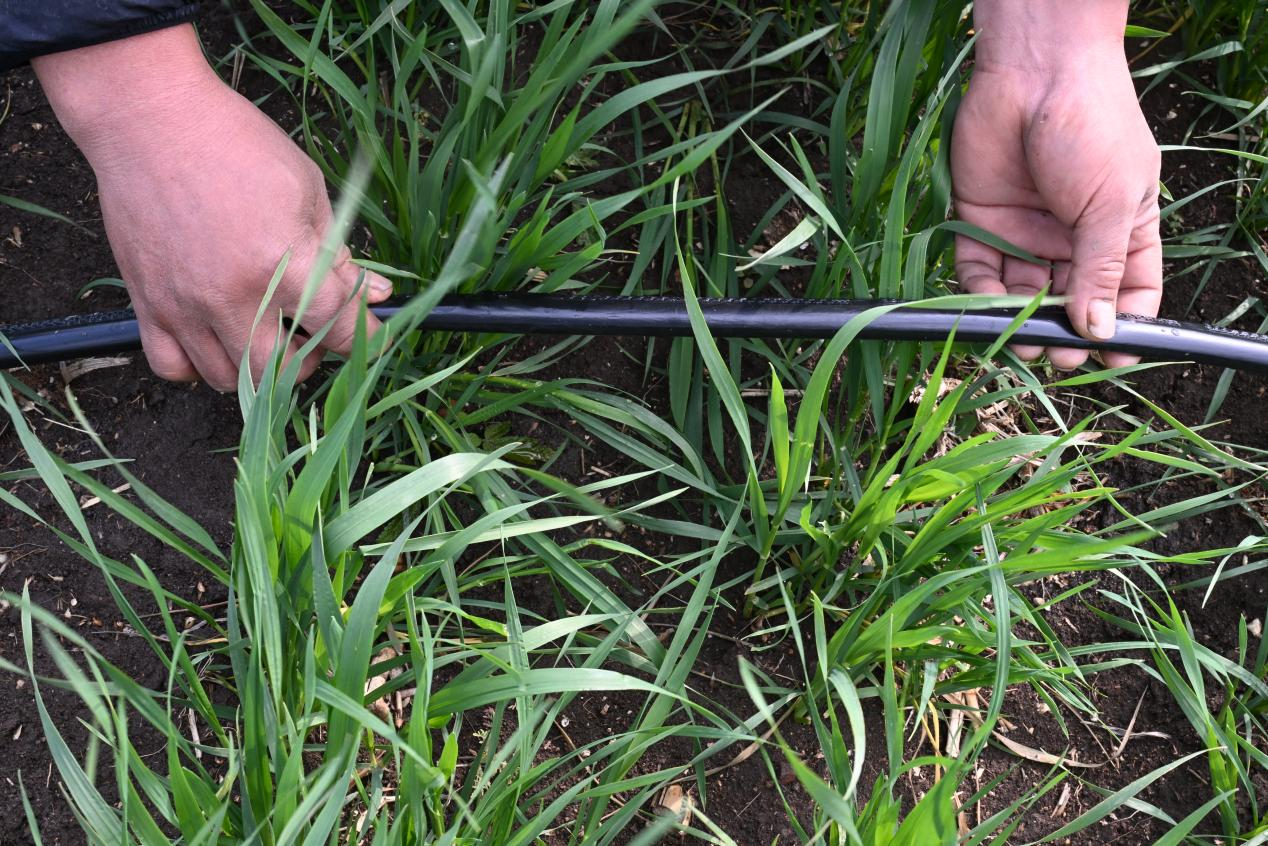 山东省青岛市即墨区大信街道杨家村一处麦田,农户查看滴灌浇灌小麦状况。(张涛 摄)