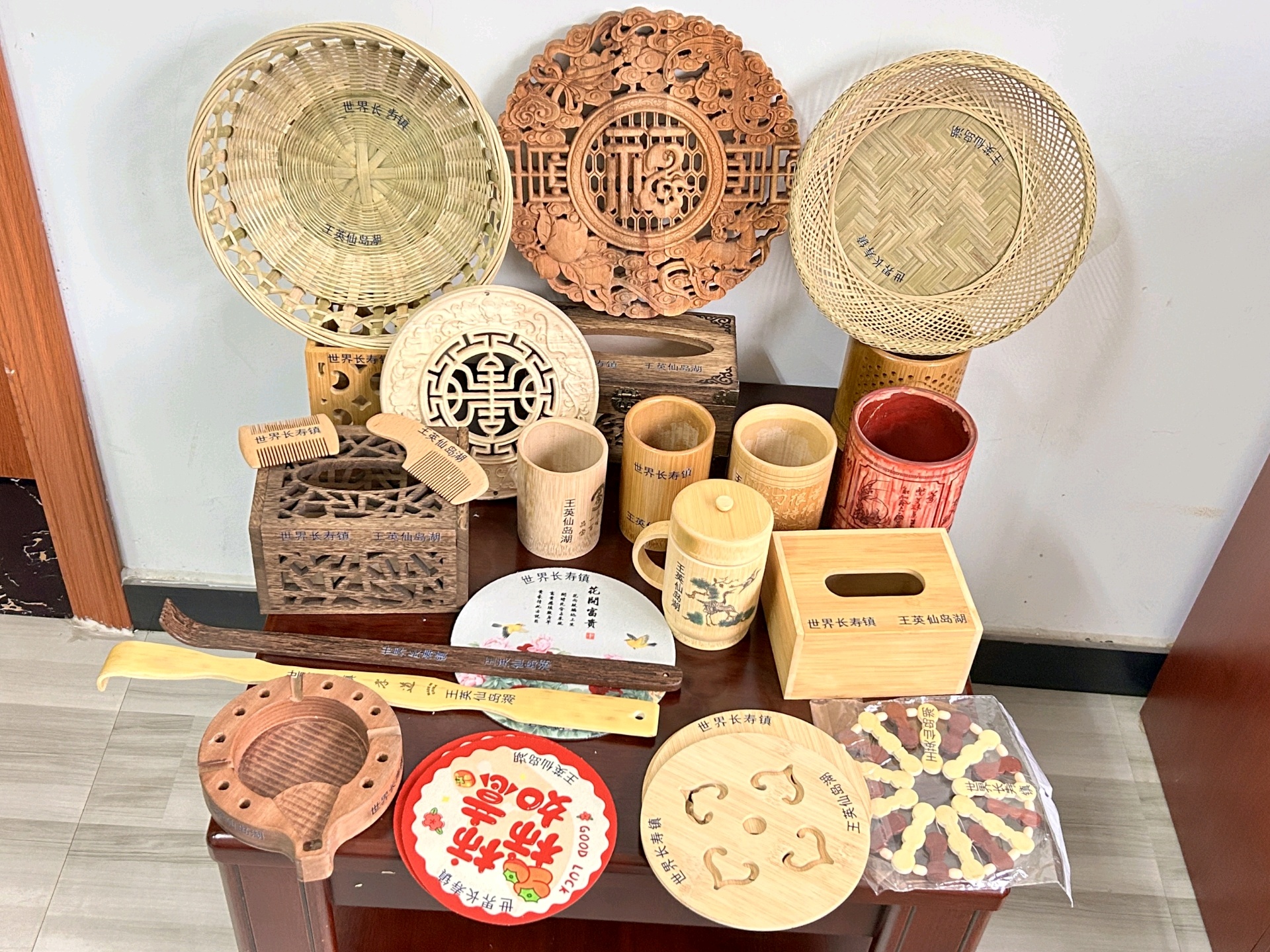 这批文创以王英本地优质竹木为原料,涵盖竹编、木雕、竹刻、木艺四大品类二十余件作品,从选料、破篾、编织到精雕、打磨、上漆,每一件都印着“世界长寿镇,王英仙岛湖”的专属字样,兼具实用价值与文化内涵。