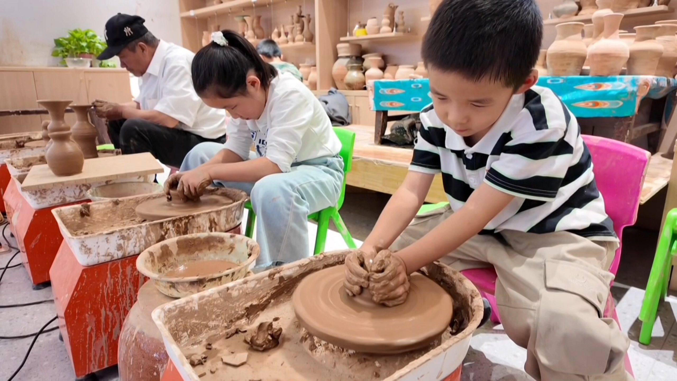 小朋友在非遗工坊体验做土陶(王陇江 摄)