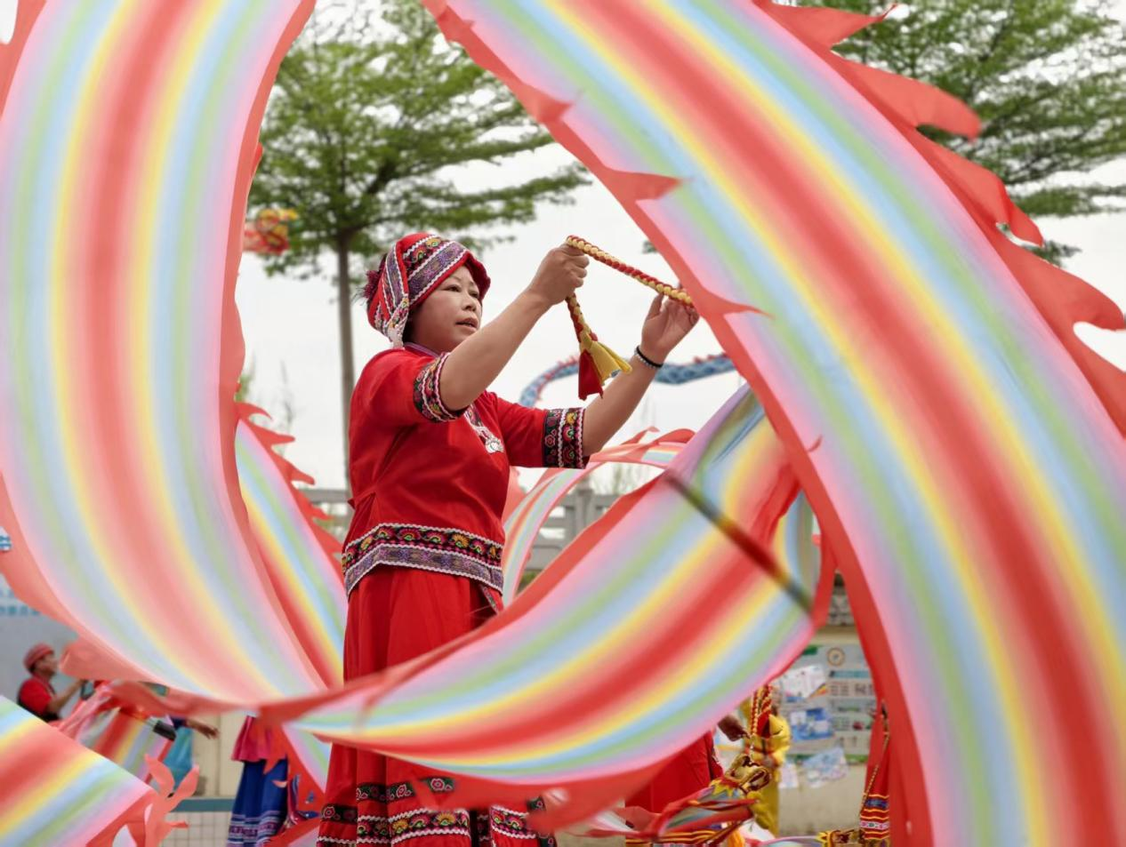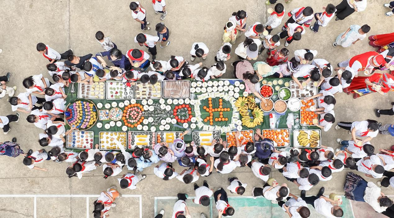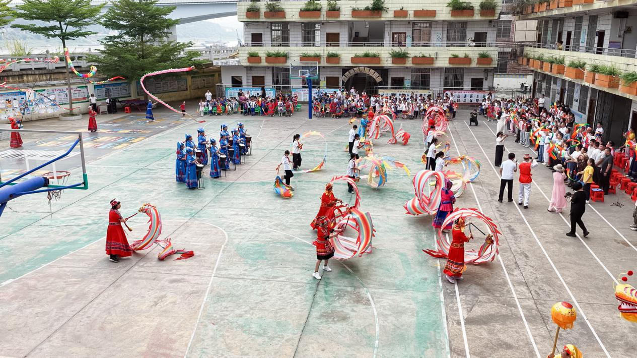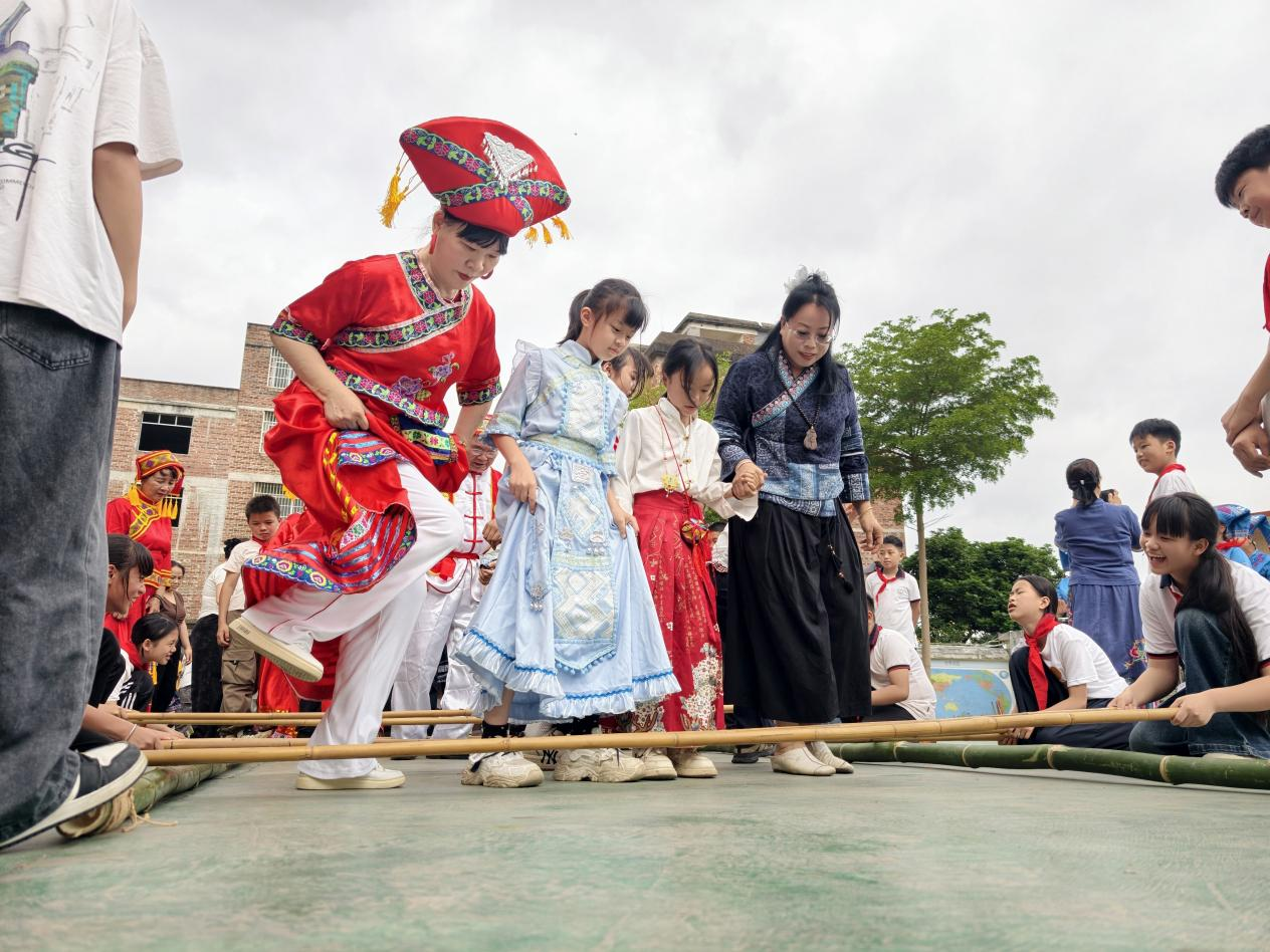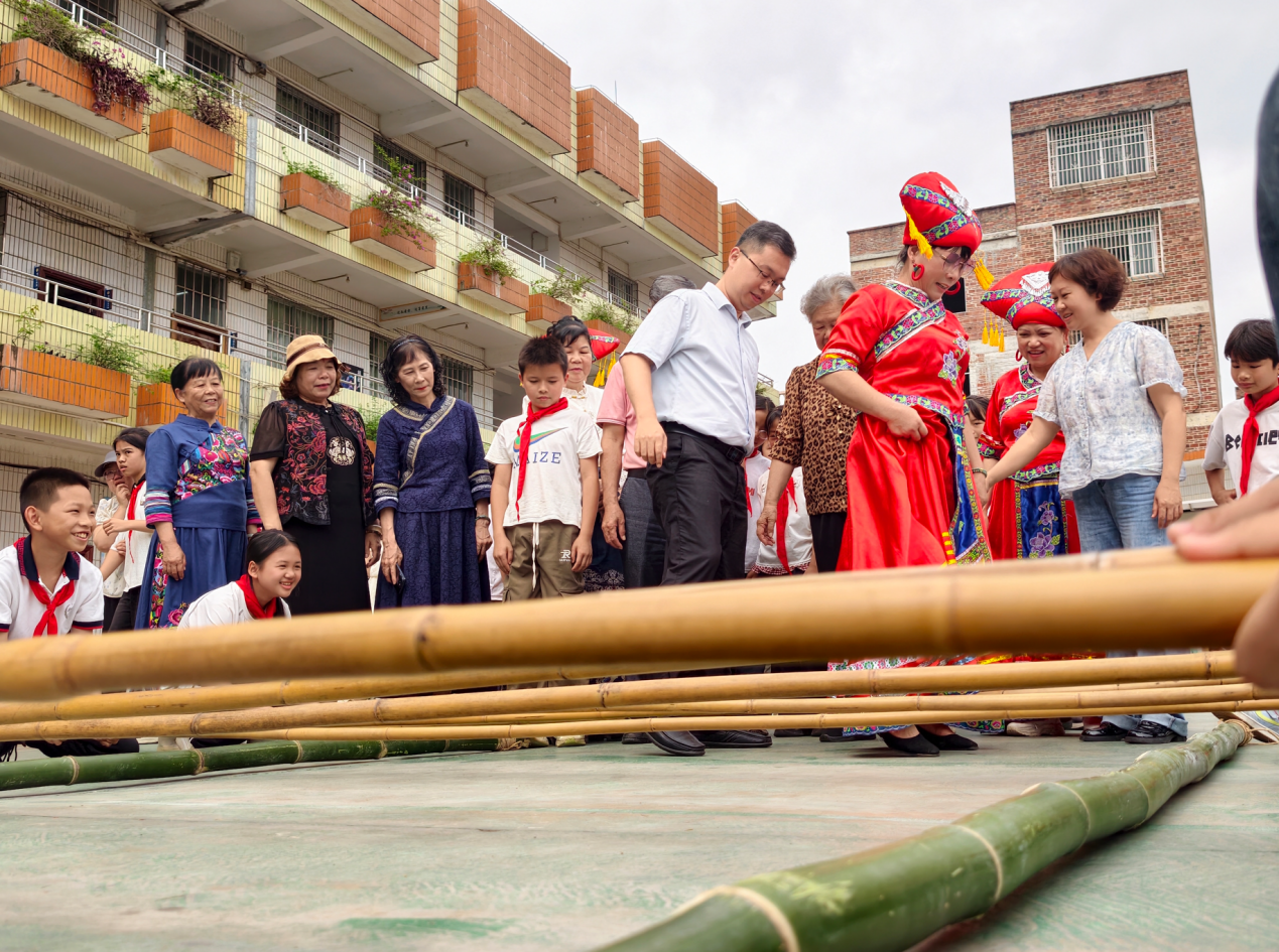 进入“礼赞三月三 欢庆踏歌来”环节,领导嘉宾与师生一起体验扇形龙、五角星的造型舞动,沉浸式体验民族文化的魅力。随后,大家踊跃参与竹竿舞、海洋球、“打地鼠”、非遗体育运动、非洲鼓等民族游戏,欢声笑语不断,现场气氛热烈。活动最后,大家还一起品尝了特色美食。