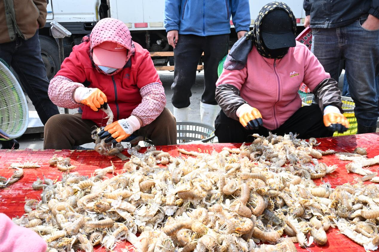 渔民将琵琶虾逐一分拣后,装车发往各地海鲜市场。(张涛 摄)