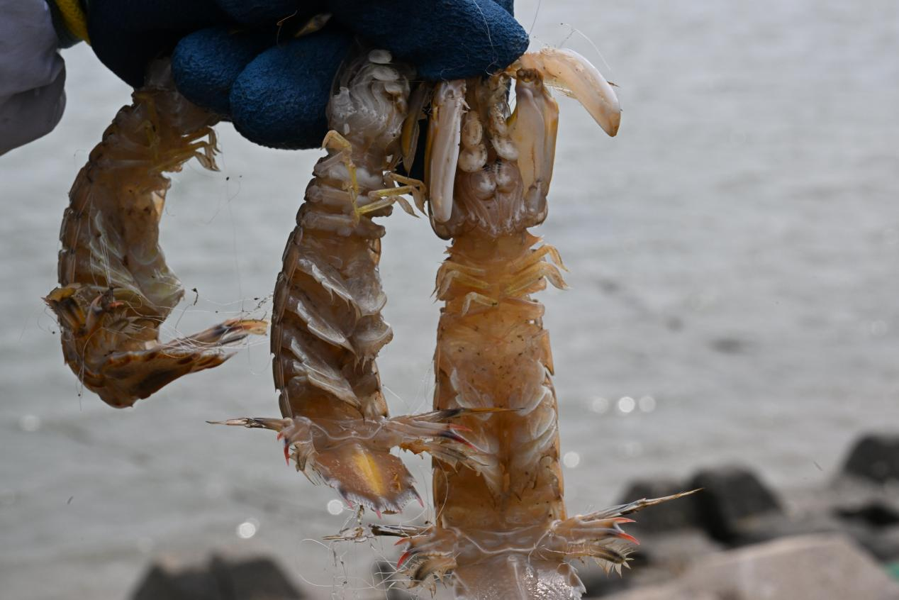 渔民展示个大肥美的琵琶虾(张涛 摄)