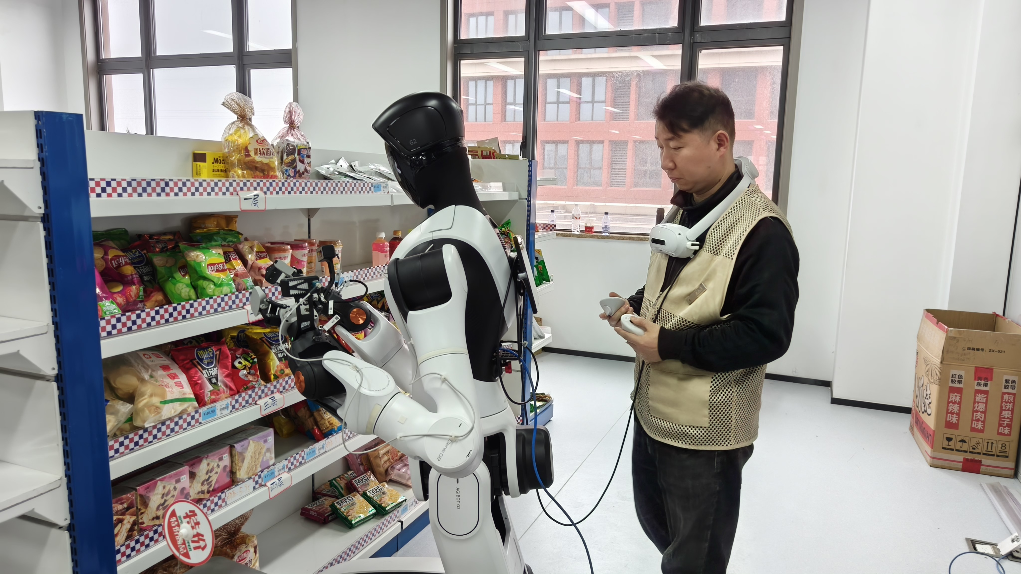 4月16日,浙江清华柔性电子技术研究院工业具身智能实训中心工作人员对机器人进行场景训练。(曾庆华 摄)