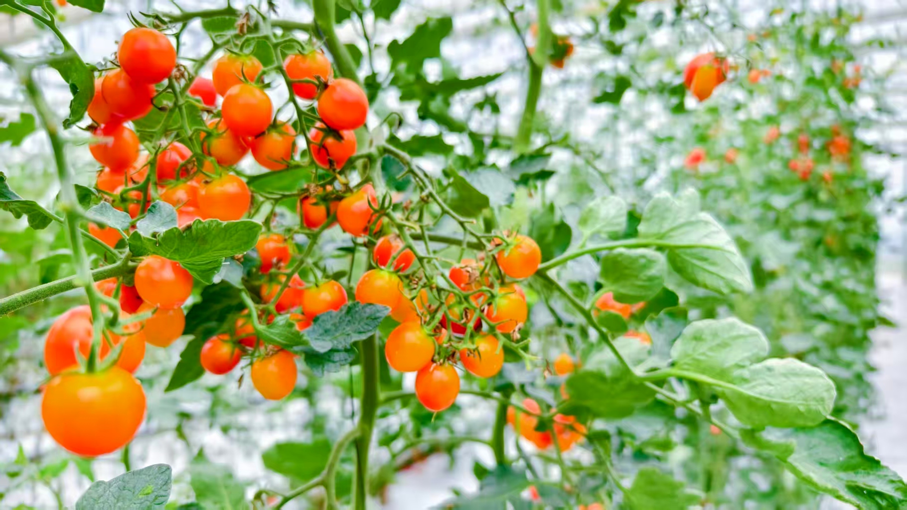 湖北番茄公社数字农场智慧大棚里,一串串鲜红小番茄挂满枝头。(李梦婷 摄)