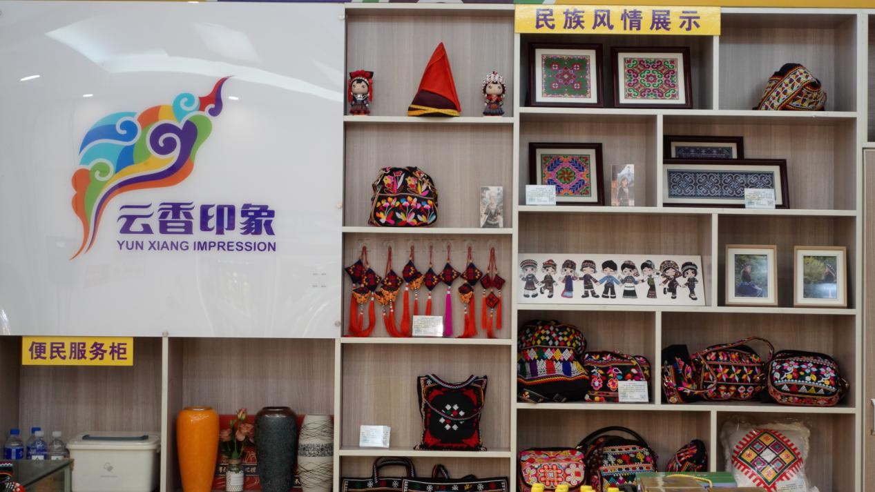 焕新后的小店让人眼前一亮:民族元素区摆满瑶药香包、傣锦杯垫、苗族银饰;便民服务角提供饮水、充电、行李寄存;墙根设《旅行指南》展台,来客可扫码获取文旅资讯。