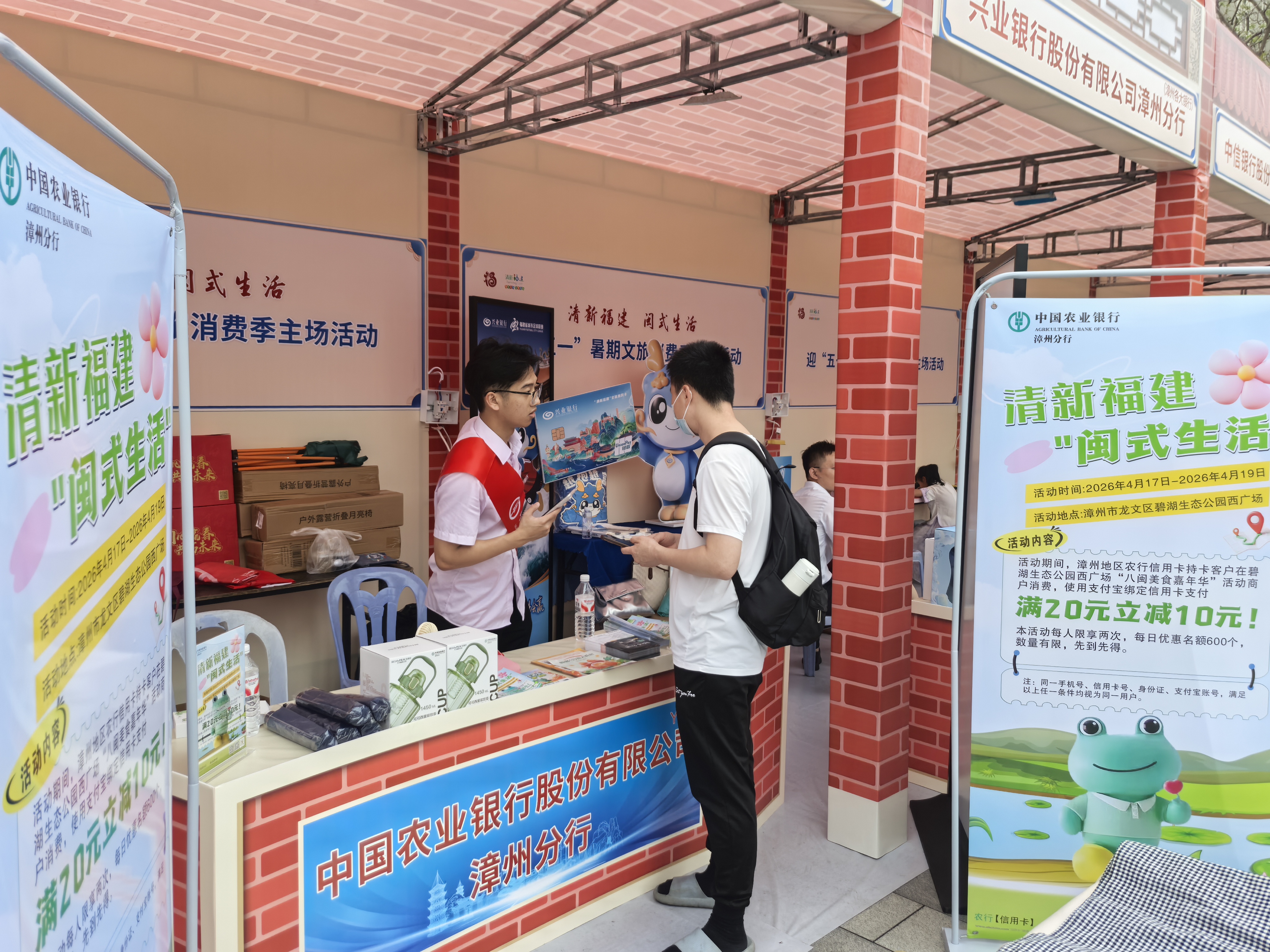 4月17日至4月19日,“清新福建 闽式生活”迎“五一”暑期文旅消费季主场活动在福建省漳州碧湖生态公园西广场举行。中国农业银行漳州分行、龙文支行紧扣金融支持消费主线,深度融合金融服务与美食消费场景,以务实惠民举措激发消费活力,为市民带来便捷实惠的消费新体验。