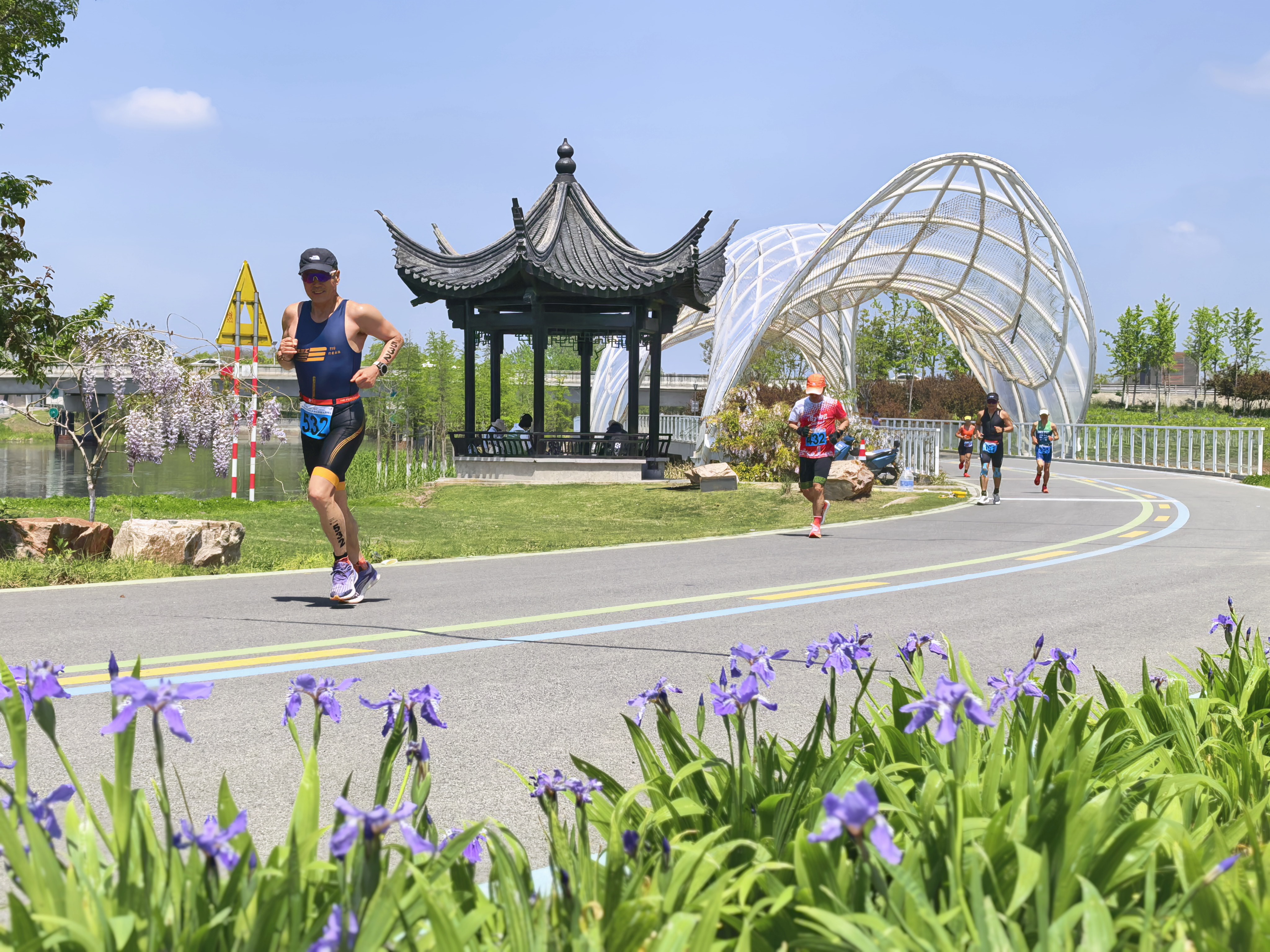 游泳赛段在碧波荡漾的蟒蛇河未来水世界展开;自行车赛道全长44公里,沿生态廊道蜿蜒,途经三胡故里、红星窑厂遗址等人文地标;10公里跑步赛道则完全在河畔林荫与花海中穿行。四月的盐都,月季、月见草、鼠尾草、鸢尾等各色花卉交织,宛如一幅流动的油画,选手的每一步都踏在风景里。