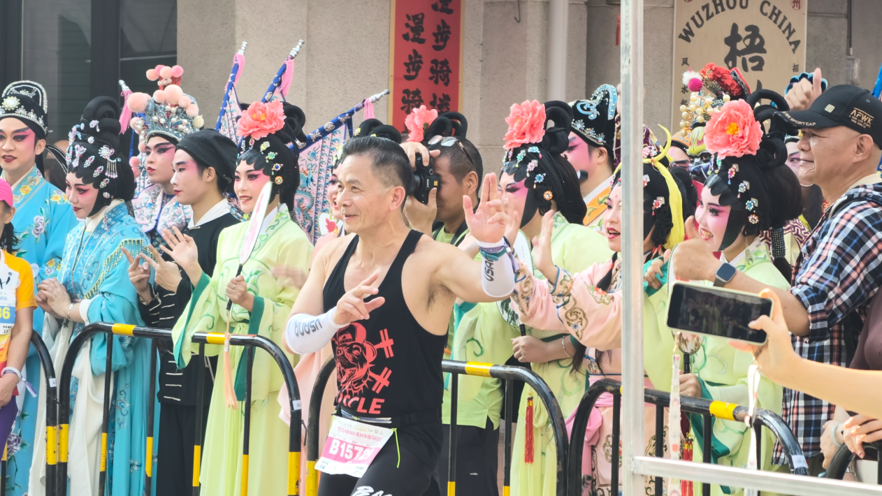 身着粤剧戏服的演员们为跑者挥手助威(麦好明 摄)