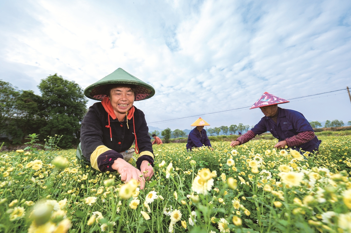 11月10日,在浙江省武义县白姆乡金坛村杭白菊种植基地,工人们忙着采收盛开的杭白菊。