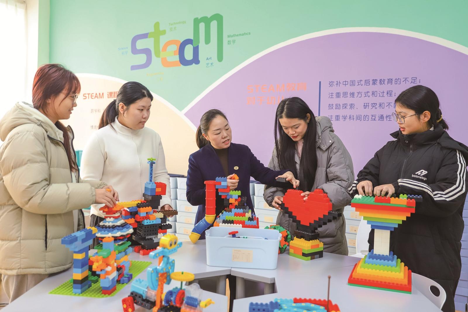 12月24日,在山东青岛恒星科技学院未来教育学院实践教学基地,老师指导学生学习创造力建构。近年来,青岛市李沧区依托专业院校构建“产教融合、校企一体”的人才培养体系,鼓励高校积极开展托育人才培养,为社会输送了大批托育人才。张 鹰摄/中经视觉