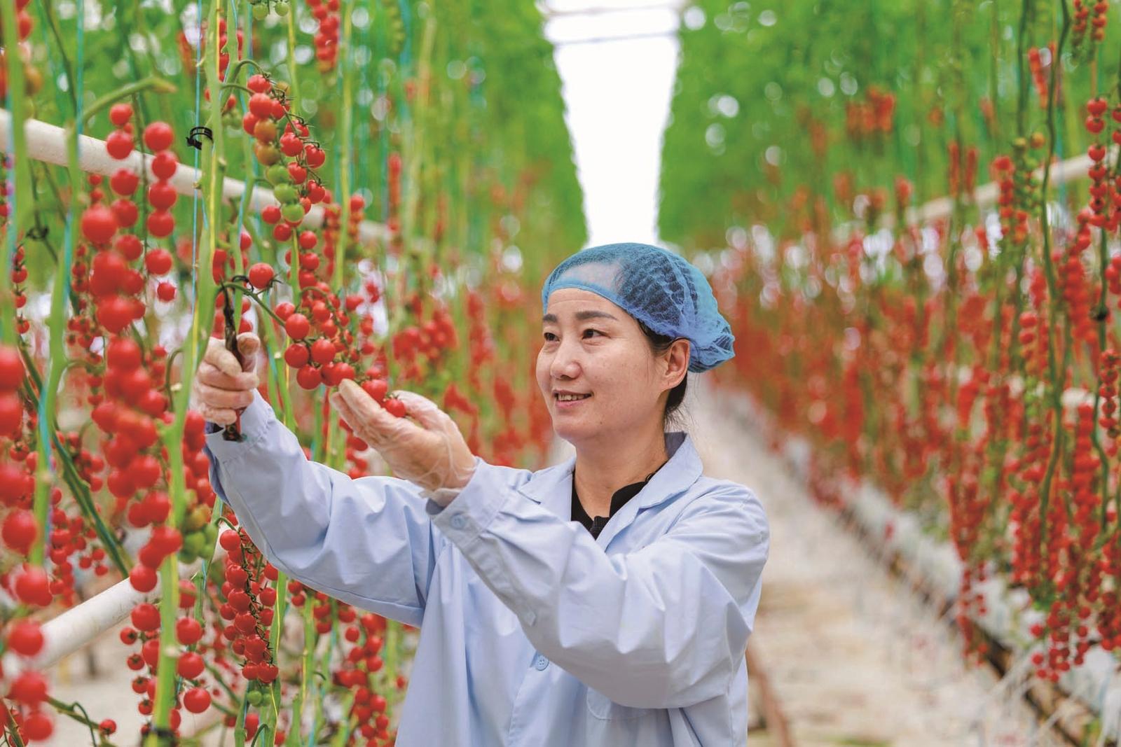 1月7日,新疆乌鲁木齐高新技术产业开发区(新市区)北区工业园的高新植物工厂内一派繁忙景象,工作人员在采摘成熟的普罗旺斯雪山果和玲珑雪山果番茄。孙振嵩摄/中经视觉
