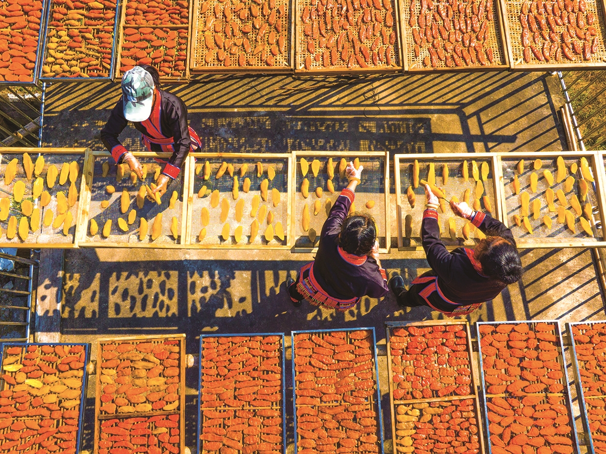 现在正值红薯干制作的最佳时期,1月12日,广西金秀瑶族自治县忠良乡巴勒村村民正在院落里晾晒红薯干,供应年货市场。