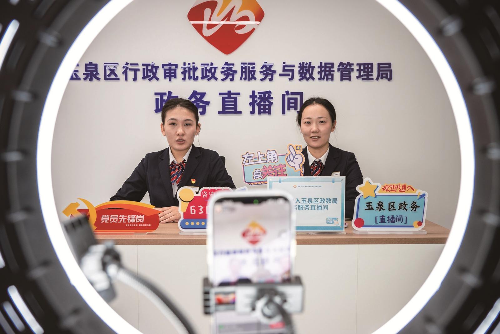 图为日前,玉泉区政务服务中心“党员先锋岗”的党员青年志愿者在开展政务服务直播。