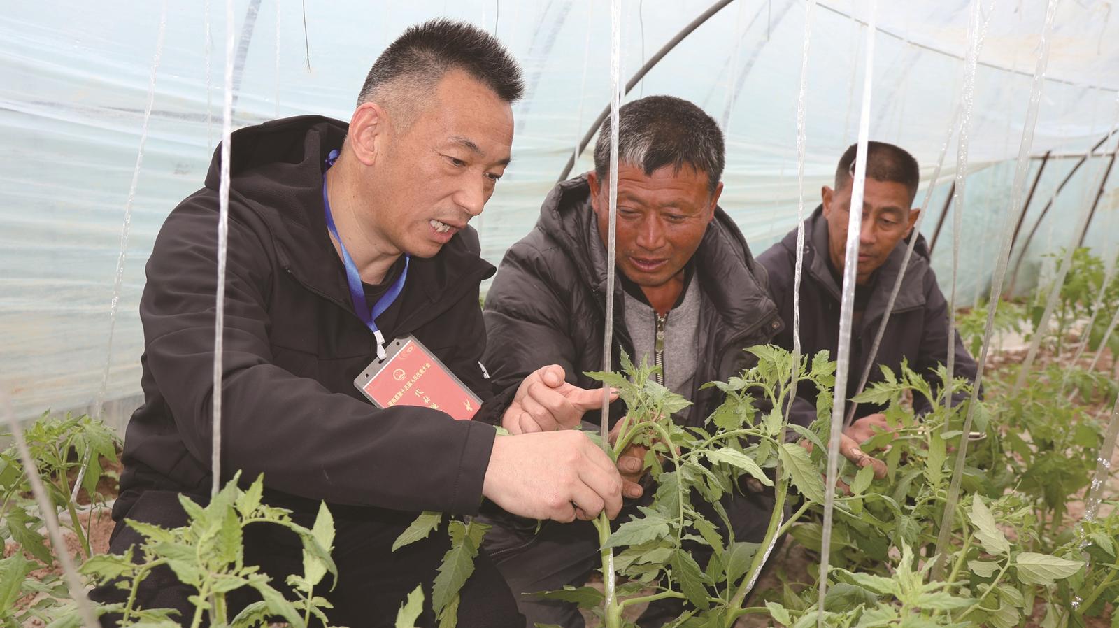 图为4月9日上午,灌南县人大代表史红伟(左)在田楼镇设施大棚蔬菜基地,详细察看西红柿长势。通讯员 王 华摄