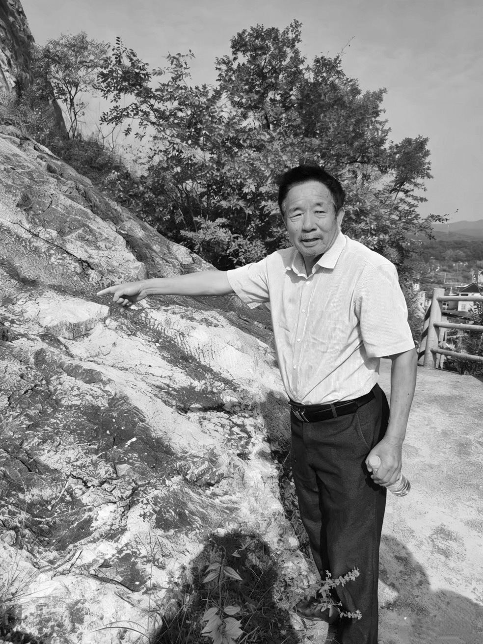 2023年11月8日,徐裕西在鸡公山登山口“龙脉”景点向游客讲述自己保护文化遗址的经历。通讯员 彭芳梅摄