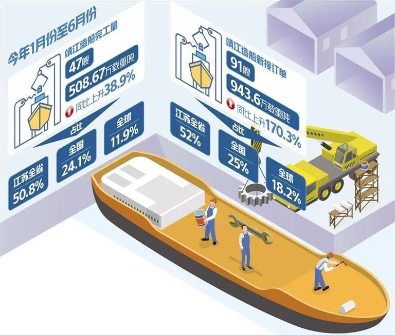 工信部数据显示,上半年我国造船完工量、新接订单量和手持订单量以载重吨计分别占世界总量的49.6%、72.6%和53.2%,以修正总吨计分别占47.3%、67.2%和46.8%,均位居世界第一。其中,来自江苏靖江的扬子江船业集团公司继续保持全国手持订单排名第一位;同样来自靖江的江苏新时代造船有限公司造船完工量排名全国第一位。