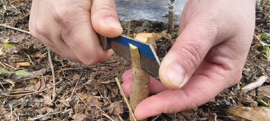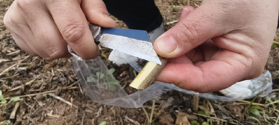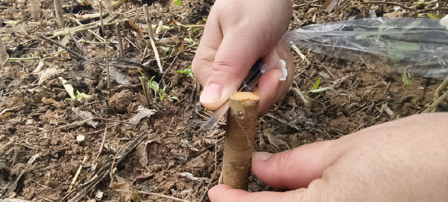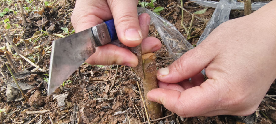 “我从事苗木嫁接有50多年了,还记得最早开始的时间是1975年左右,没有中断过这门技术。”邓元章说,“当年学习嫁接技术是为了发展集体经济,收入就是挣工分,一天10分。把技术转化成个人收入是从1984年开始, 嫁接一株能挣到3分钱。现在嫁接一株,本地纯收入在4毛钱左右,外地在6毛钱左右。”