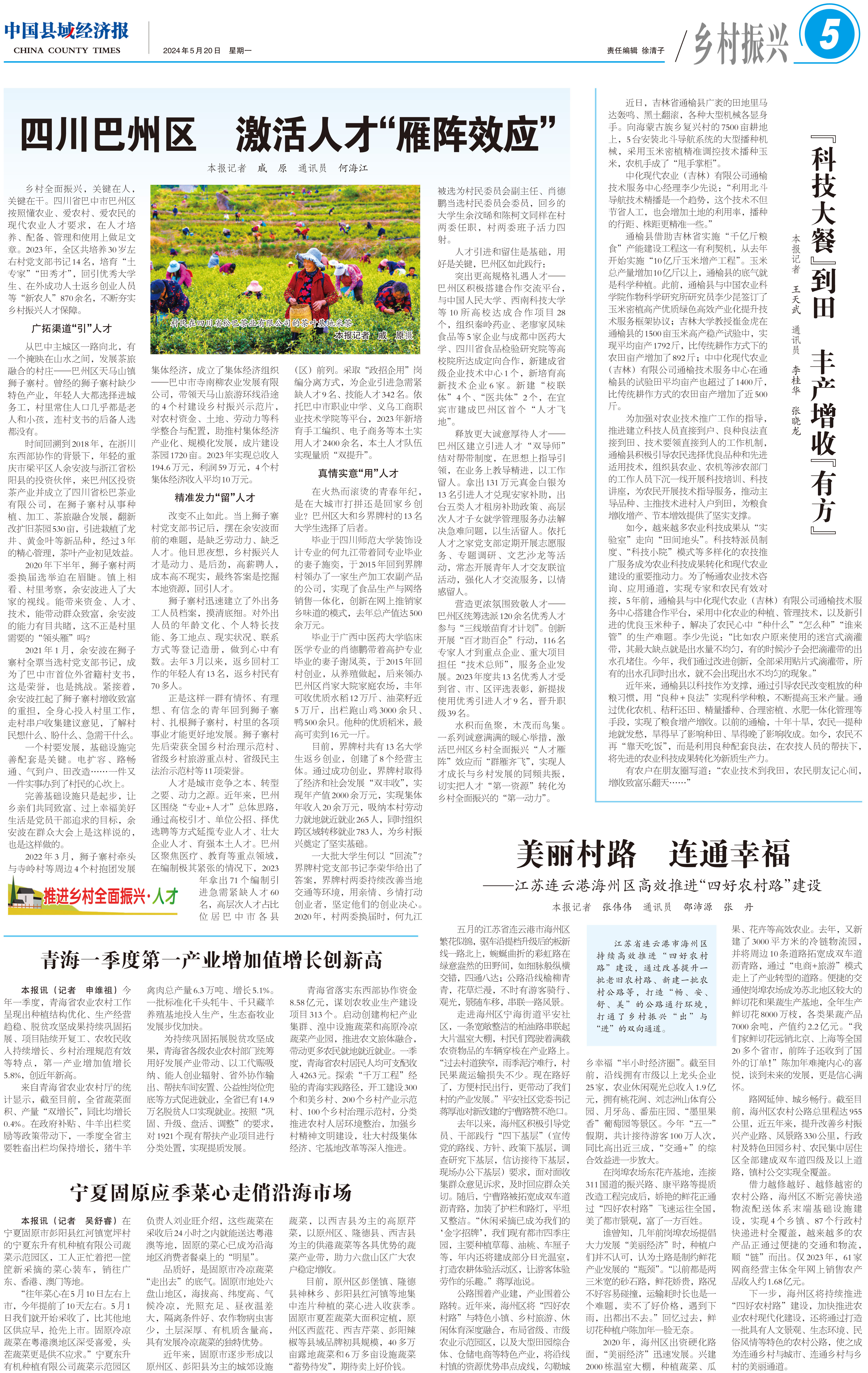 乡村全面振兴,关键在人,关键在干。四川省巴中市巴州区按照懂农业、爱农村、爱农民的现代农业人才要求,在人才培养、配备、管理和使用上做足文章。2023年,全区共培养30岁左右村党支部书记14名,培育“土专家”“田秀才”,回引优秀大学生、在外成功人士返乡创业人员等“新农人”870余名,不断夯实乡村振兴人才保障。