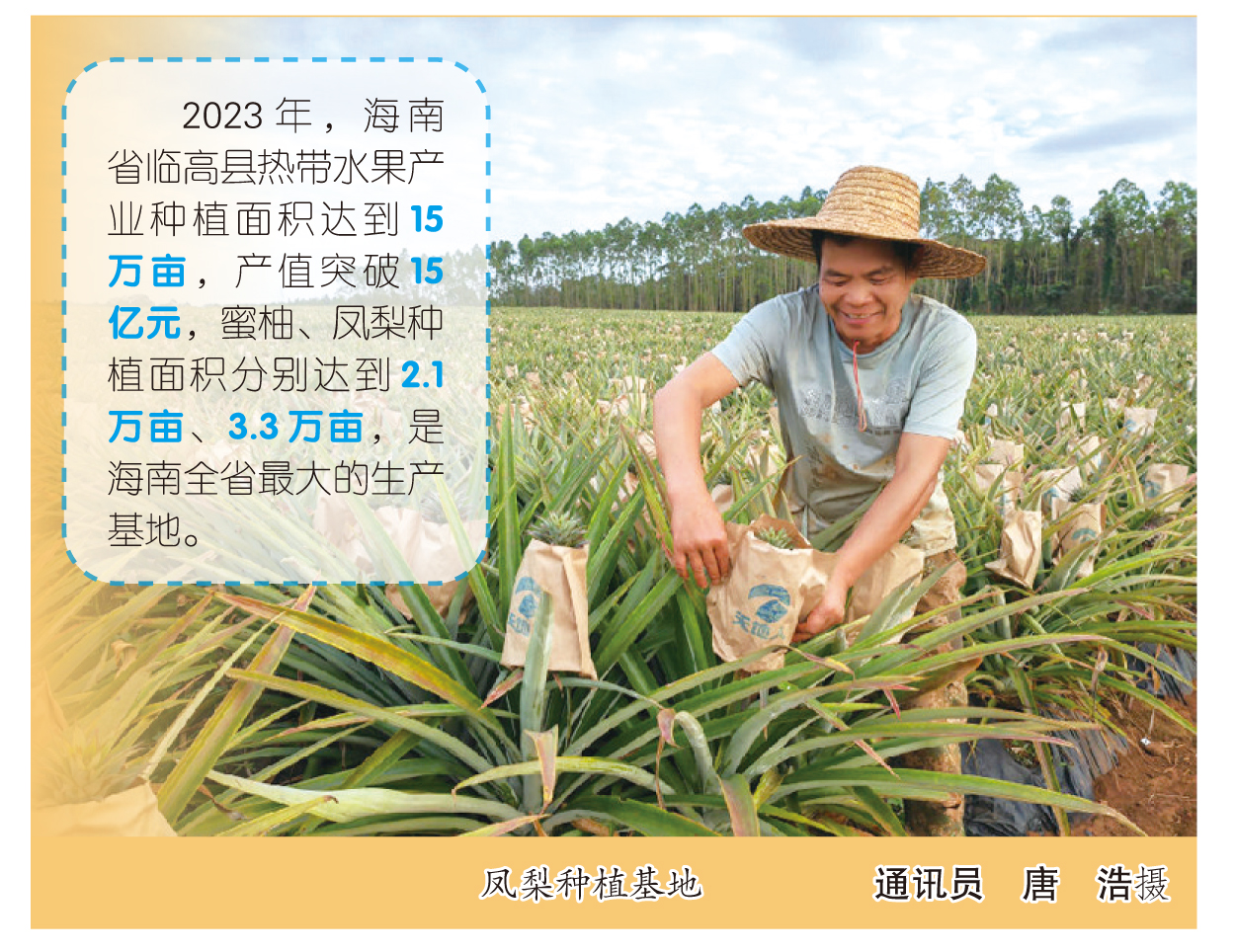 “我们采用‘合作社+企业’的经营模式,有效提高了凤梨的品质和市场竞争力。”皇桐镇党委书记陈圣灵介绍,皇桐镇立足“一镇一业”,将凤梨种植产业作为热带特色高效农业产业持续推广。采取“企业+合作社+农户”种植发展模式,指导合作社整合约1200亩闲置土地资源种植凤梨,2023年种植了765亩凤梨,预计2024年收成可达370万斤,不仅壮大村集体经济,还带动村民增收致富。