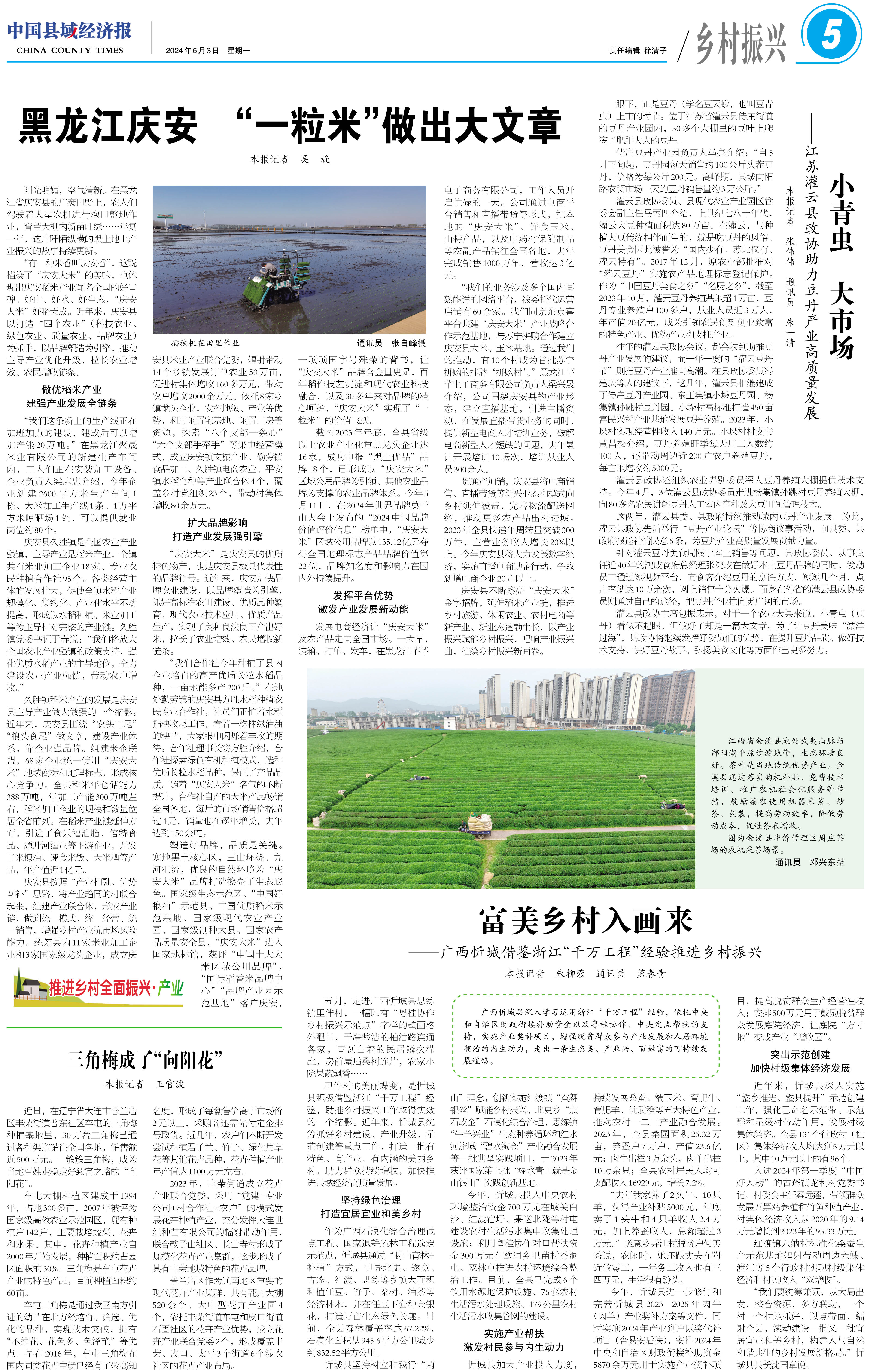庆安县不断擦亮“庆安大米”金字招牌,延伸稻米产业链,推进乡村旅游、休闲农业、农村电商等新产业、新业态蓬勃生长,以产业振兴赋能乡村振兴,唱响产业振兴曲,描绘乡村振兴新画卷。(本报记者 吴 旋)