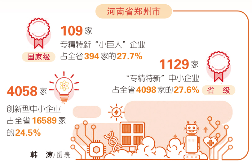 2023年,郑州市印发《郑州市重大科技项目创新管理办法》,加强专精特新“小巨人”企业培育。目前,全市现有创新型中小企业4058家,占全省16589家的24.5%;省级“专精特新”中小企业1129家,占全省4098家的27.6%;国家级专精特新“小巨人”企业109家,占全省394家的27.7%。