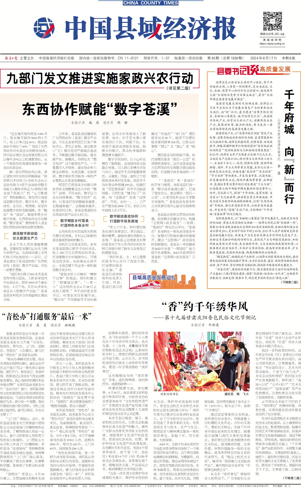 苍溪县还抢抓东西部协作机遇,加快数字化建设步伐,构建“互联网+政务服务”一张网,“苍政钉”特色办公平台、“苍通办”本地特色一体化政务服务平台、智慧大厅标准化建设相继展开,蹚出“互联网+”政务服务转型新路径。苍溪也一举创建成为2022年全省“一网通办”能力提升先进集体,2023年获评四川省首批“互联网+政务服务”示范县。(本报记者 戚 原 通讯员 韩 静)
