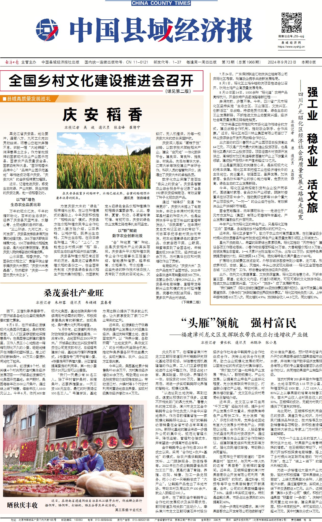 黑龙江省庆安县,地处要冲,通衢八方,九河之水宛如灵动丝线,顺着山峦起伏奔腾不息,织就一幅“大地锦缎”,润泽着黑土之乡。作为首批授牌的国家现代农业产业园示范县、国家农产品质量安全县、国家级制种大县,“国际稻香米品牌中心”“品牌产业园示范基地”等相继成功落户庆安,“庆安大米”的金字招牌更加耀眼。