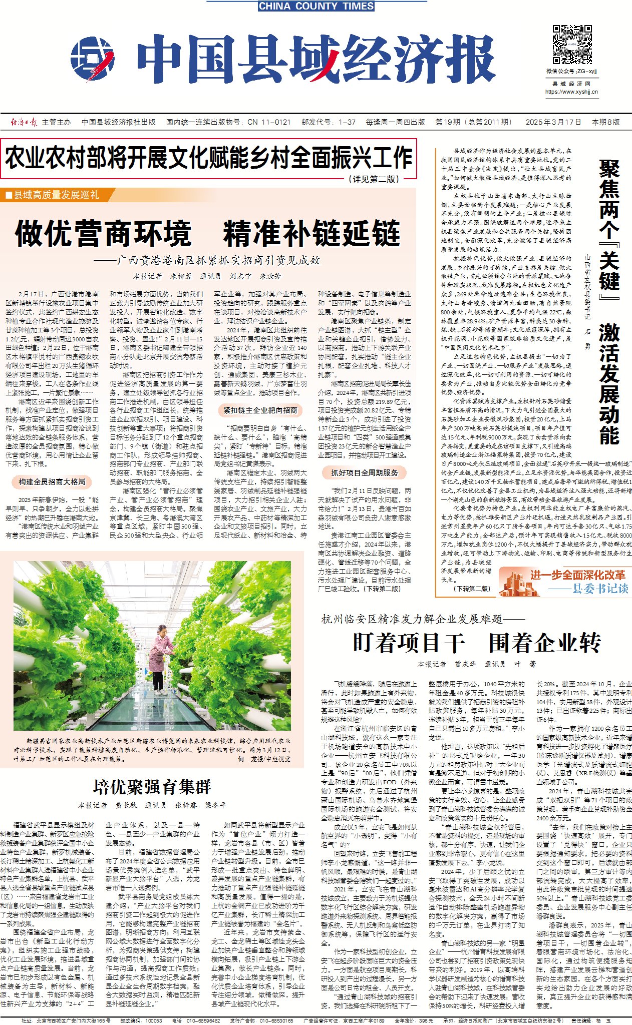 2月17日,广西贵港市港南区新塘镇举行设施农业项目集中签约仪式,共签约广西耕宏生态种植专业合作社现代渔业旅游及甘蔗种植加工等3个项目,总投资1.2亿元,辐射带动周边3000亩农田绿色种植;2月22日,位于港南区木格镇平悦村的广西贵翔农牧有限公司年出栏20万头生猪循环经济项目建设现场,工地里的车辆往来穿梭,工人在各条作业线上紧张施工,一片繁忙景象……