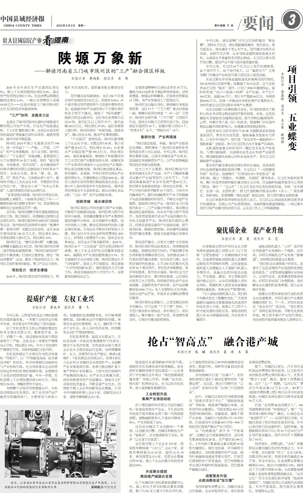 “工业强区”成势见效。陕州区新增规上工业企业17家,总数达到136家,累计完成产值214亿元,同比增长15.4%;10条重点产业链完成产值190.5亿元,同比增长24%。高端装备制造、精细化工和铝精深加工三大百亿级产业集群加快布局,铝精深加工产业获评河南省中小企业特色产业集群。特色农业提振发展。陕州区推动绿色果品、种养循环、食用菌、中草药等四大特色产业链持续壮大,已建成果品示范园2000亩,成功入选农业农村部老旧果园改造试点县;连续3年入选河南省养牛大县培育县,再次获评河南省肉羊大县培育县;新认证绿色食品2款,“三品一标”农产品增至50款。