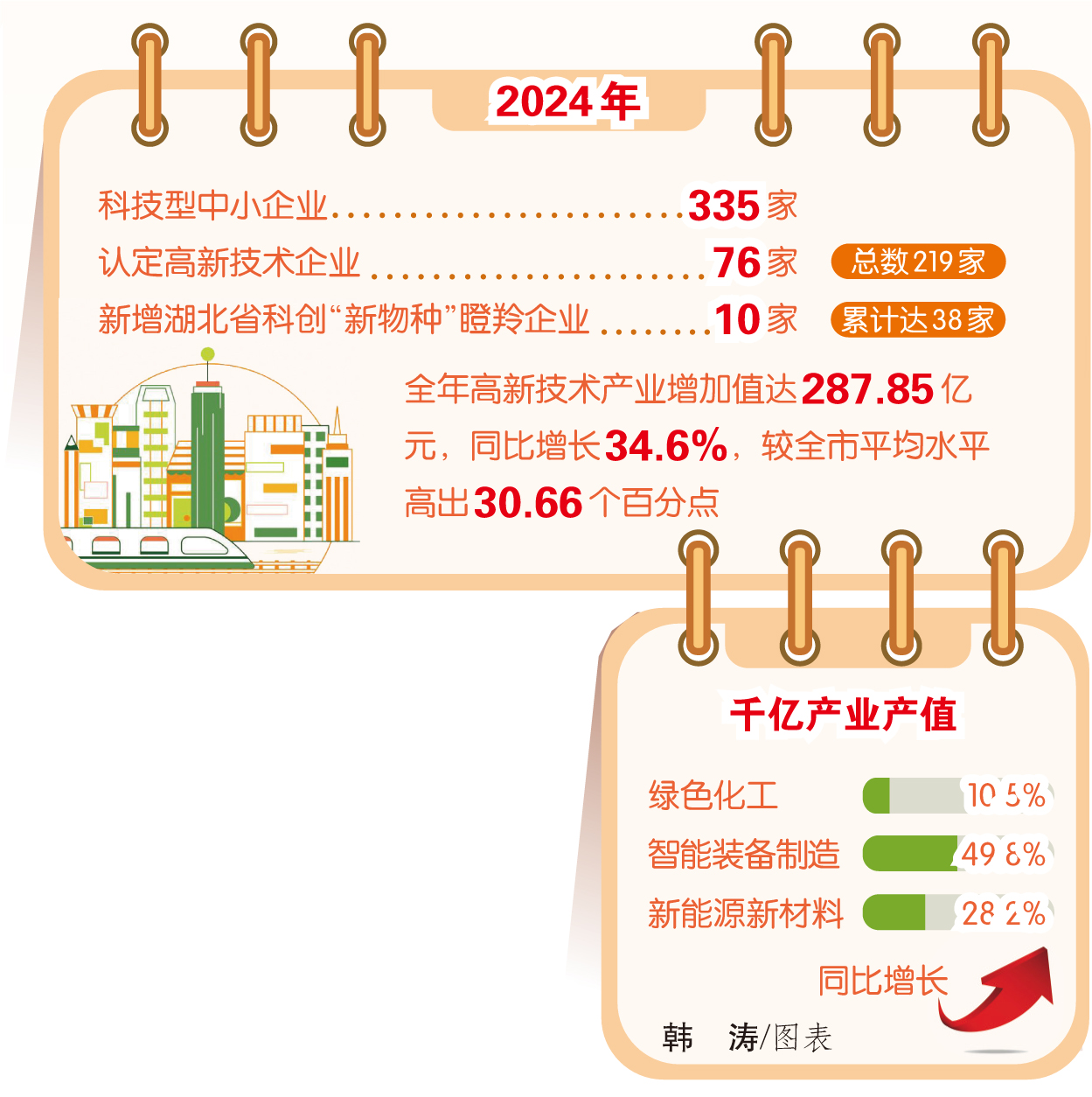 2024年,荆门高新区·掇刀区共培育科技型中小企业335家;高新技术企业认定成功76家,总数增至219家;新增湖北省科创“新物种”瞪羚企业10家,累计达38家;绿色化工、智能装备制造和新能源新材料三大千亿产业的产值,同比增长10.5%、49.8%与28.2%;全年高新技术产业增加值达到了287.85亿元,同比增长34.6%,占地区生产总值比重达53.26%,较全市平均水平高出30.66个百分点。