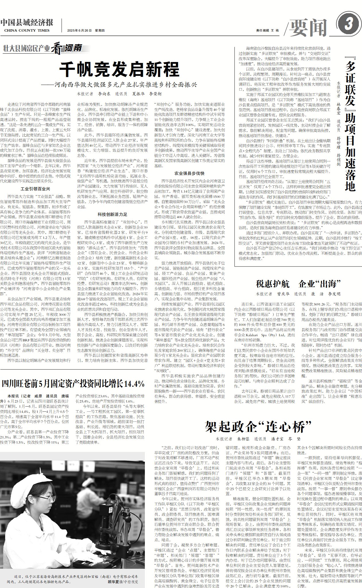 强力推进开放招商。西华县依托电子信息产业园、智能制造产业园、线缆线束产业园、轻工产业园、食品产业园、重装产业园、循环经济产业园、低空经济产业园“八大园区”,深入开展以商招商、链式招商、乡情招商、平台招商,招引更多科技含量高、创新能力强、市场前景好的产业项目落户,实现企业集中布局、产业集群发展。
