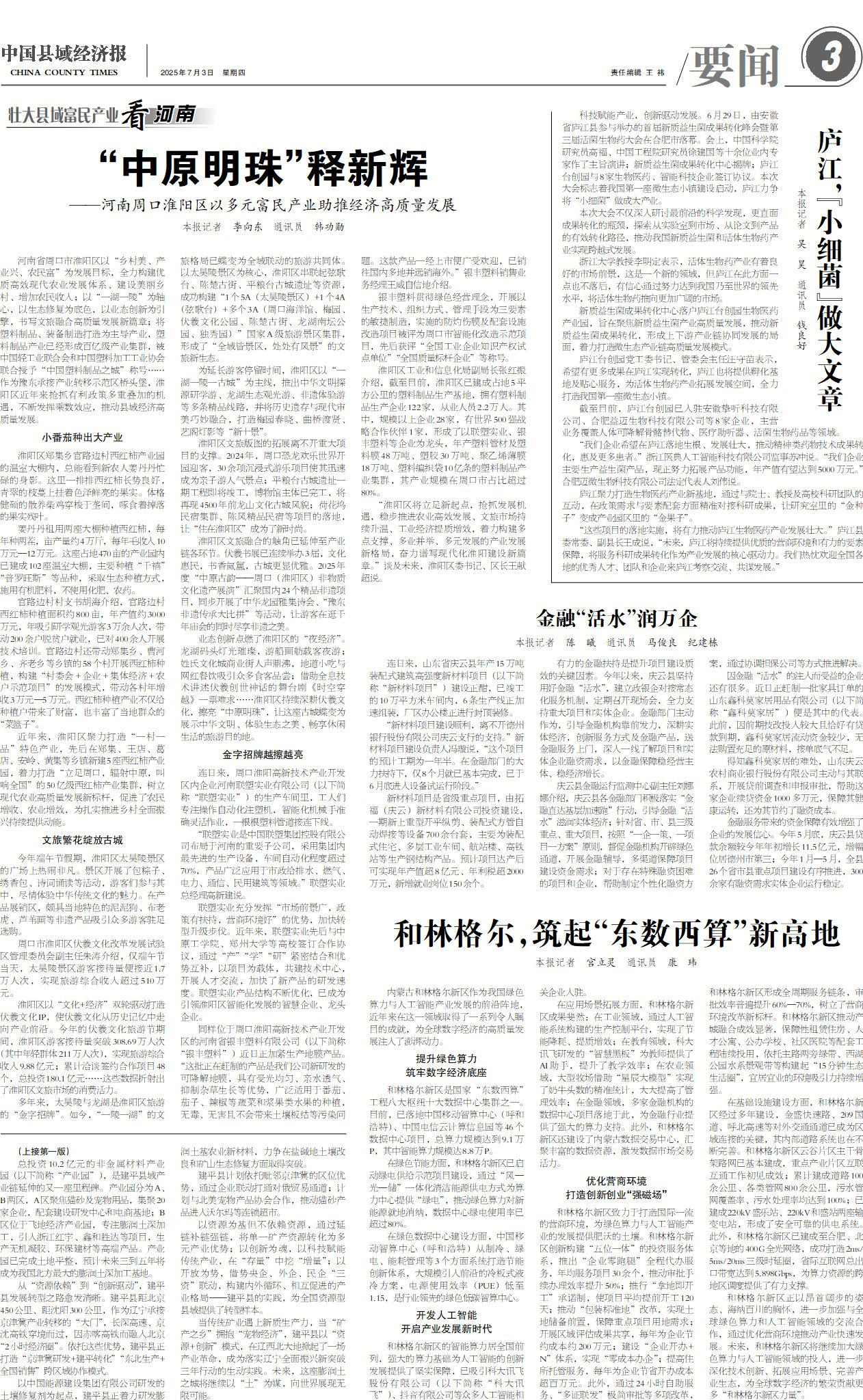 河南省周口市淮阳区以“乡村美、产业兴、农民富”为发展目标,全力构建优质高效现代农业发展体系、建设美丽乡村、增加农民收入;以“一湖一陵”为轴心,以生态修复为底色,以业态创新为引擎,书写文旅融合高质量发展新篇章;将塑料制品、装备制造打造为主导产业,塑料制品产业已经形成百亿级产业集群,被中国轻工业联合会和中国塑料加工工业协会联合授予“中国塑料制品之城”称号……作为豫东承接产业转移示范区桥头堡,淮阳区近年来抢抓有利政策多重叠加的机遇,不断发挥乘数效应,推动县域经济高质量发展。