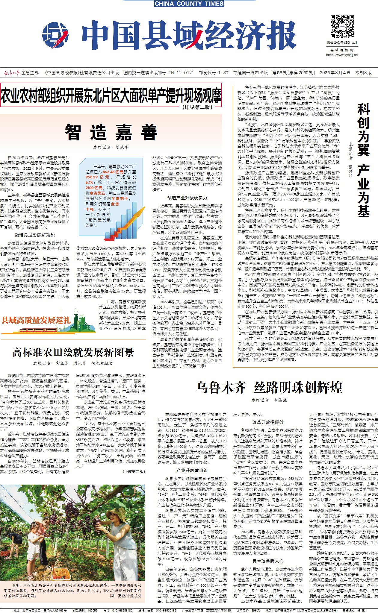 嘉善县通过“党建统领、市场运作、数字赋能、文化铸魂”四轮驱动,构建“县域经济—乡村振兴—共同富裕”螺旋上升新格局,形成可复制推广的“嘉善范式”。这一蓝图将推动嘉善从“县域经济强县”跃升为“中国式现代化县域标杆”,为全国提供城乡融合发展的系统性解决方案。(本报记者 曾庆华)