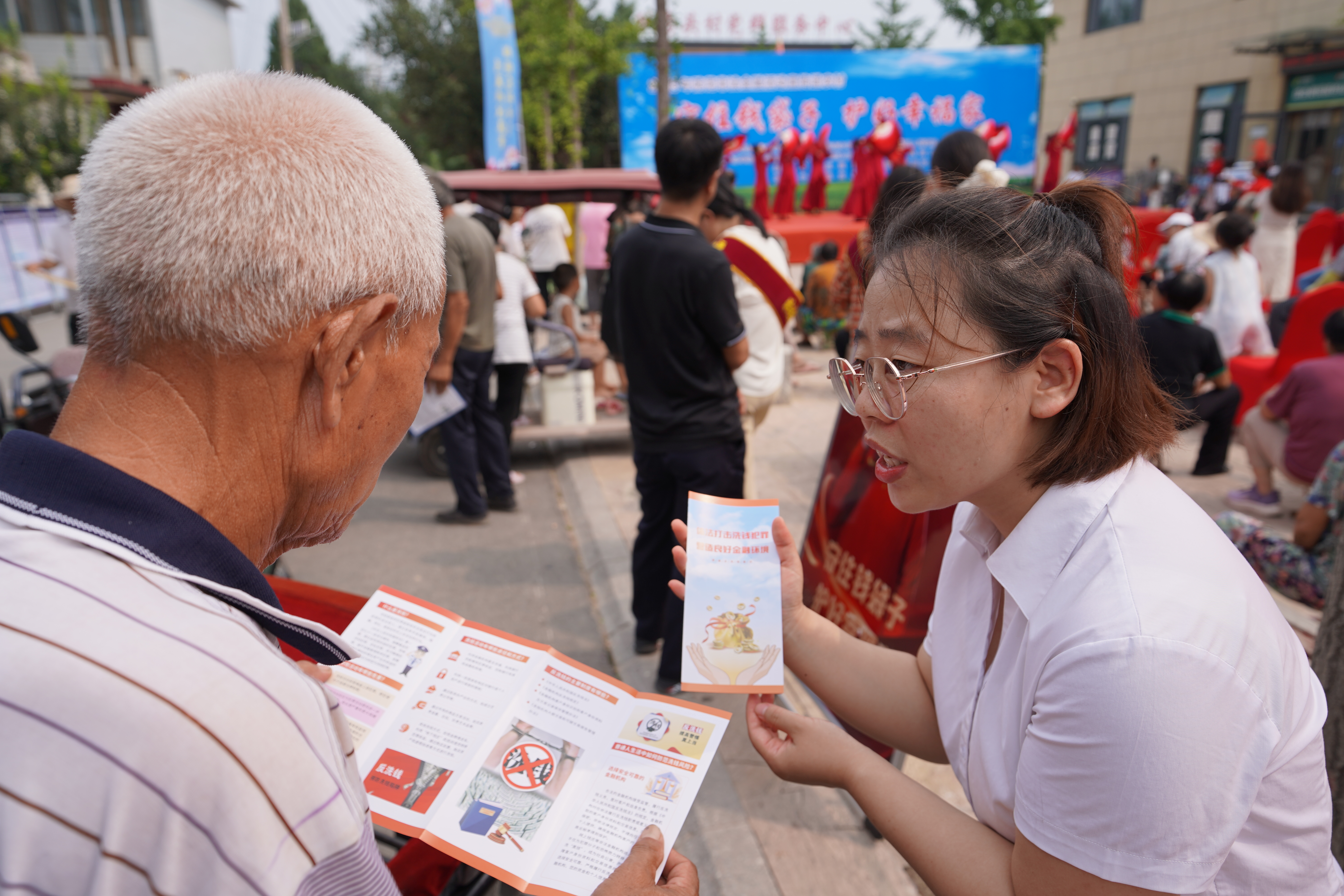 近日,河北省石家庄市鹿泉区大河镇纸房头村举办“守住钱袋子,护好幸福家”宣传活动,工作人员通过讲解与互动问答,提升居民防骗意识。