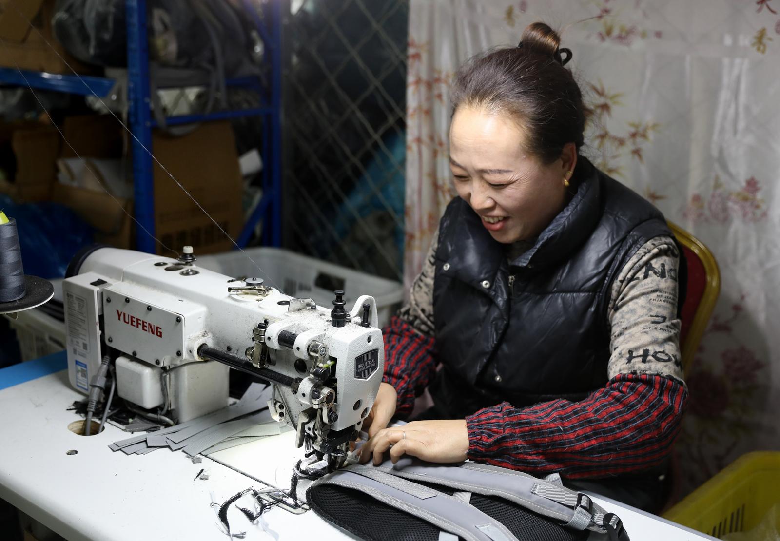 女工操作缝纫机赶制箱包(宋佳烨 摄)