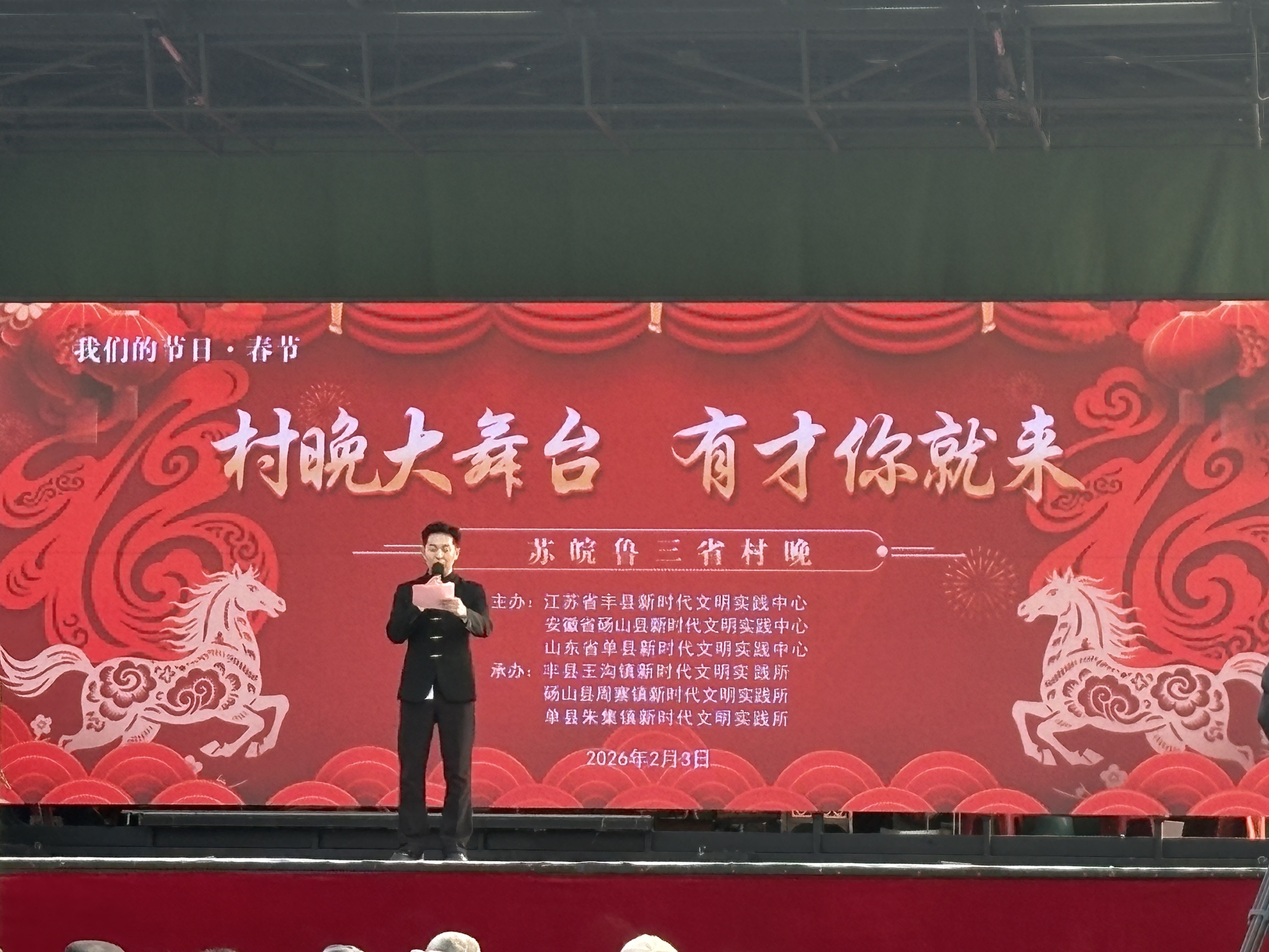“一脚踏三省,鸡晓鸣三地;一井润三省,同心迎新春!”2月3日下午,苏皖鲁三省交界的江苏省丰县王沟镇新时代文明实践文化广场锣鼓喧天、欢声如潮,“‘我们的节日·春节’村晚大舞台 有才你就来”苏皖鲁三省村晚联谊活动在此举行。来自江苏丰县、安徽砀山、山东单县的几百名乡亲欢聚一堂,以14个自编自导自演的文艺节目,奏响了马年新春的欢乐序曲,更续写了三省跨界共建、文明共兴的时代篇章。