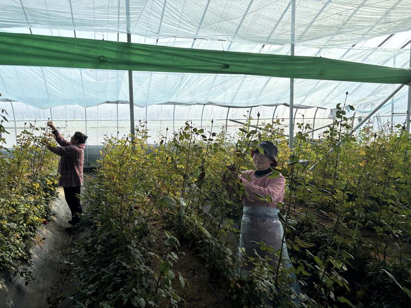 山禾花卉家庭农场玫瑰园基地工人正在修剪枝头(张伟伟 摄)