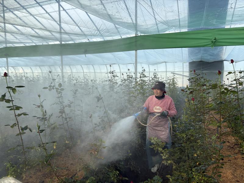山禾花卉家庭农场玫瑰园基地工人正在喷洒药物(张伟伟 摄)