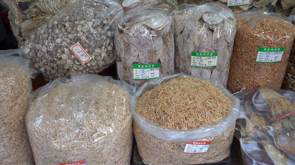 东门菜市场的各类海鲜干货(徐世国 摄)