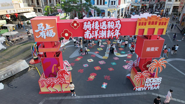 走进海口骑楼老街北门广场,一个象征祥瑞的“骑楼骏马”艺术装置跃入眼帘,其灵动的造型与百年骑楼相映成趣。“本次年货节围绕‘百年骑楼、南洋风情、新春气象’三大元素,设置了‘福、禄、寿、喜、财’五大主题街区,将骑楼建筑与新春装饰巧妙融合,形成强视觉打卡氛围。《骑楼寻马记》NPC剧情互动游戏、黄包车夫与南洋邮差角色扮演等创新体验,让游客在互动中感受节日趣味。”海口骑楼老街投资开发有限公司企划高级经理黄赫介绍,活动持续38天,涵盖南洋风情演艺、非遗民俗展演、元宵灯会巡游等内容,日均客流量将突破10万人次,开幕前4天累计接待游客36.6万人次,展现出强劲的市场吸引力。