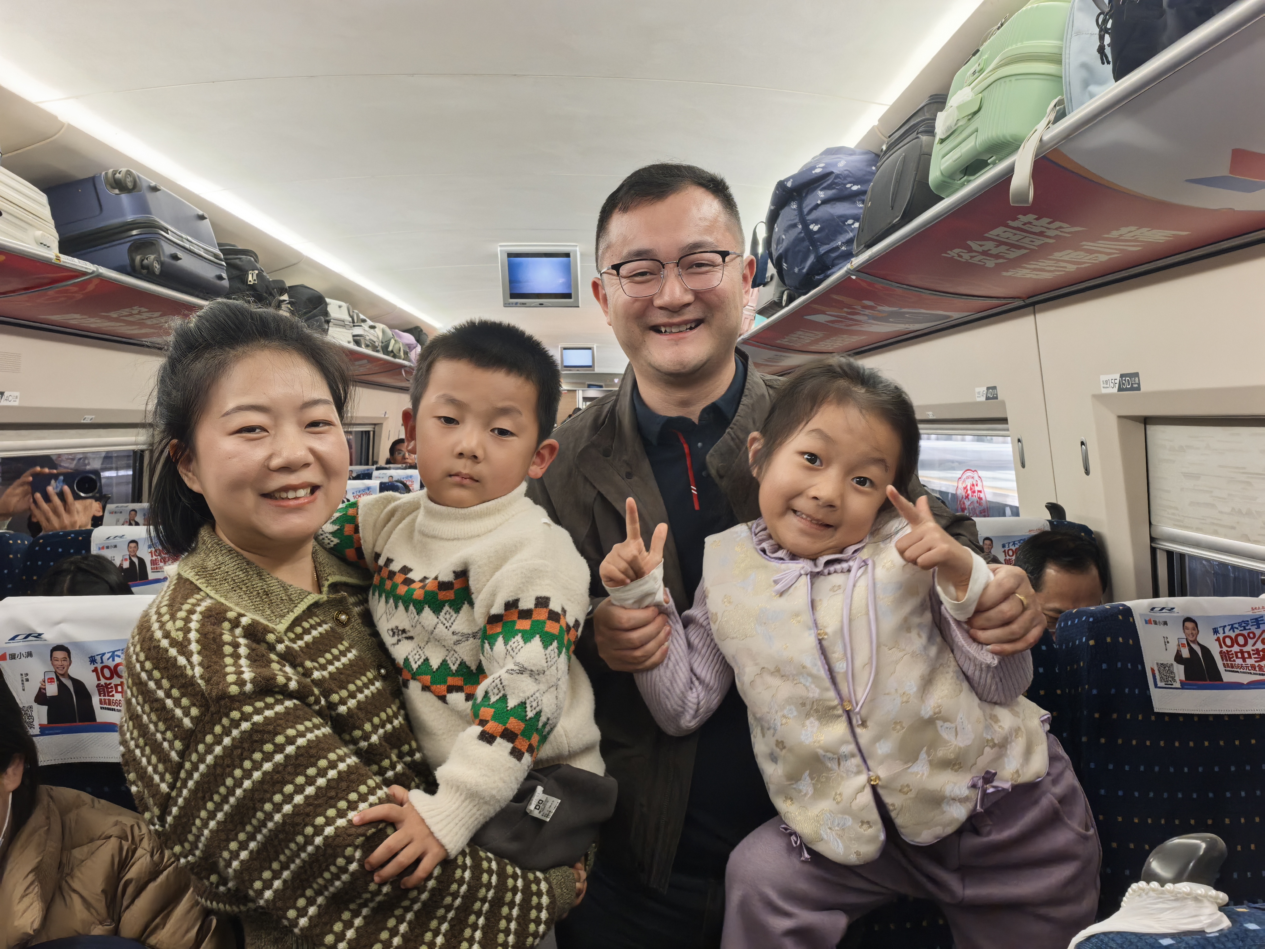 王晨一家四口开心地乘坐荆门首趟返乡专列(余惠玲 摄)