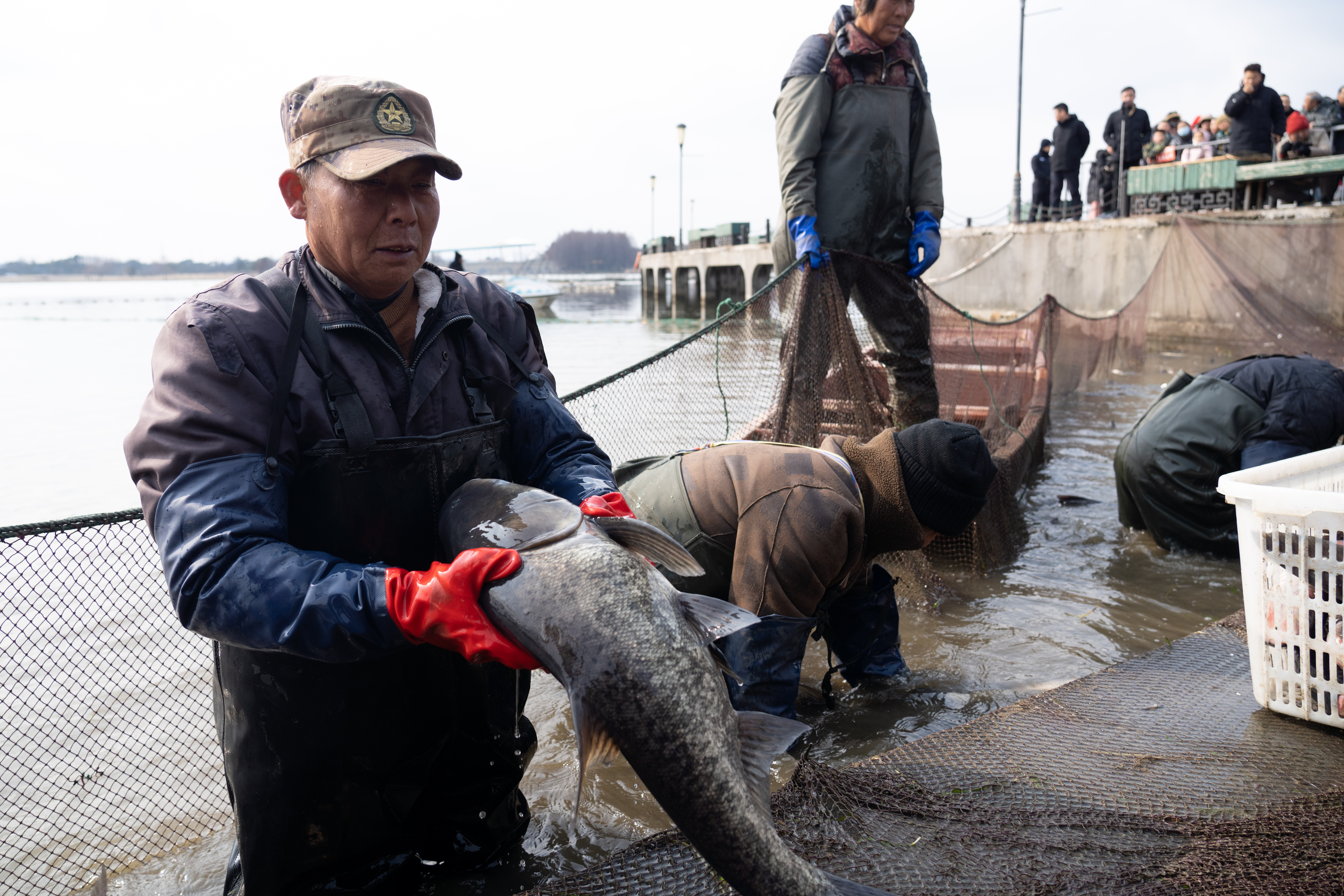 湖面之上,生态冬捕拉开序幕。随着鸣锣声响,20余名渔工齐声吆喝、协力拉网,千米围网缓缓收拢,肥硕的螺蛳青、胖头鲢、草鱼在网中翻腾跳跃,鳞光闪烁间尽显丰收盛景。“心湖里的鱼都是生态野生的,你看这鱼背黑得发亮!”渔工刘建荣身着防水服,在浅水中麻利地将大鱼装入竹筐。为守护水域生态平衡,活动严格遵循科学养护原则,渔工们将未达重量标准的小鱼小心放回湖中,践行“以水养鱼、以渔提质”的生态理念。据估算,此次冬捕总产量达四千斤,其中一尾螺蛳青重达三十斤。岸边市民排起长队,争相抢购寓意“年年有余”的新春年鱼。