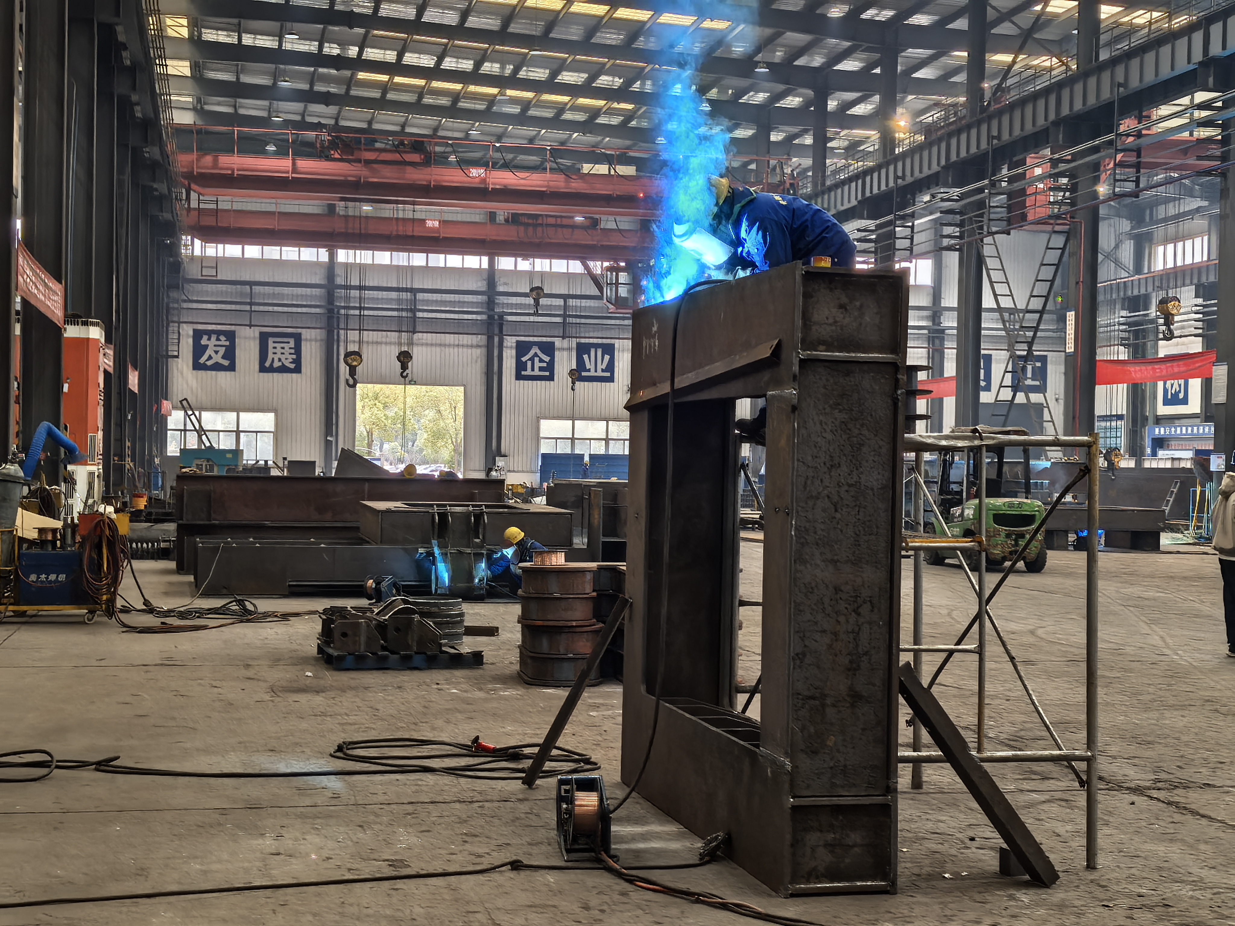 工人正在焊接中铁16局合湛铁路900吨单主梁架桥机小车(余惠玲 摄)