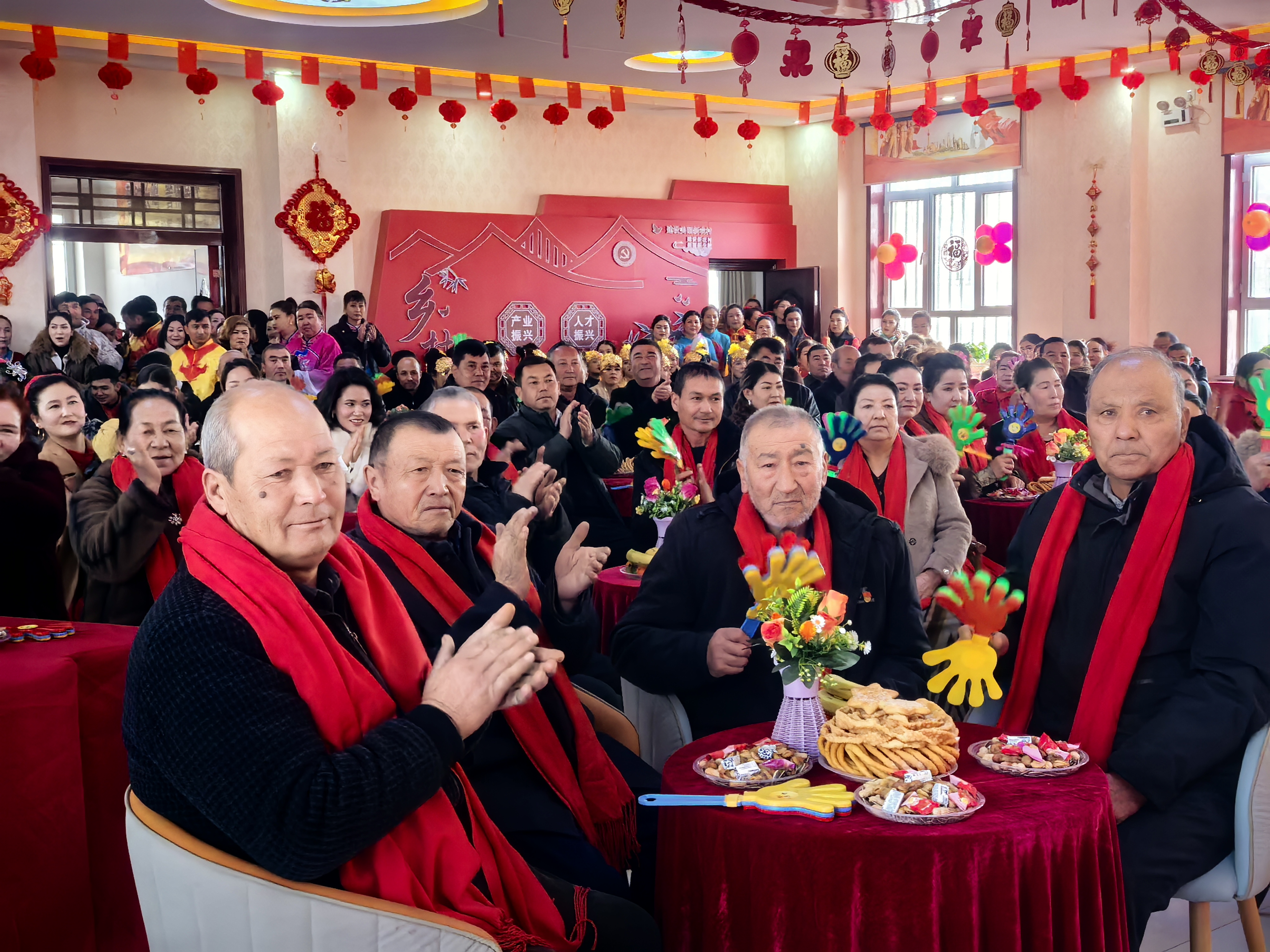 这里没有专业炫目的灯光,却有最真挚灿烂的笑容;没有万众瞩目的明星大咖,主角全是朝夕相伴的邻里乡亲。村民们围坐一堂,桌上摆满馓子、糖果、鲜果,大家举着手机记录美好瞬间,掌声与欢笑声此起彼伏。阿克布隆村村民艾山·买买提全程举着手机拍摄,笑意盈盈地说:“家门口的晚会,热闹又暖心,比啥都好看!”