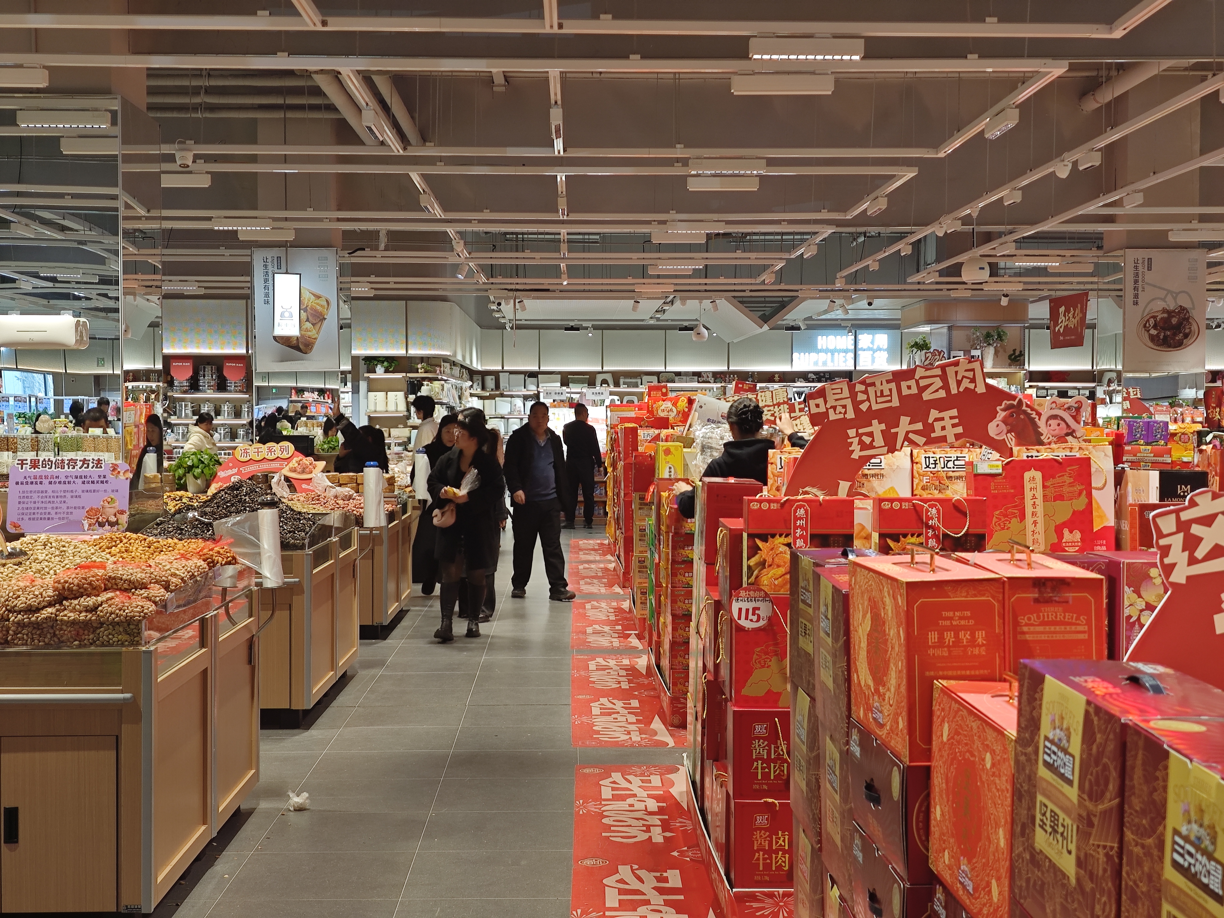 “我就住在附近,现在买菜购物方便多了,来一趟全办齐。”正在置办年货的顾客郝素菊推着满满当当的购物车笑着说。超市内,果蔬生鲜、粮油米面、熟食卤味、零食饮料分区明确,品类齐全;外围餐饮区,简餐、快餐、特色小吃香气扑鼻,不少顾客正在就餐区休息用餐,烟火气十足。