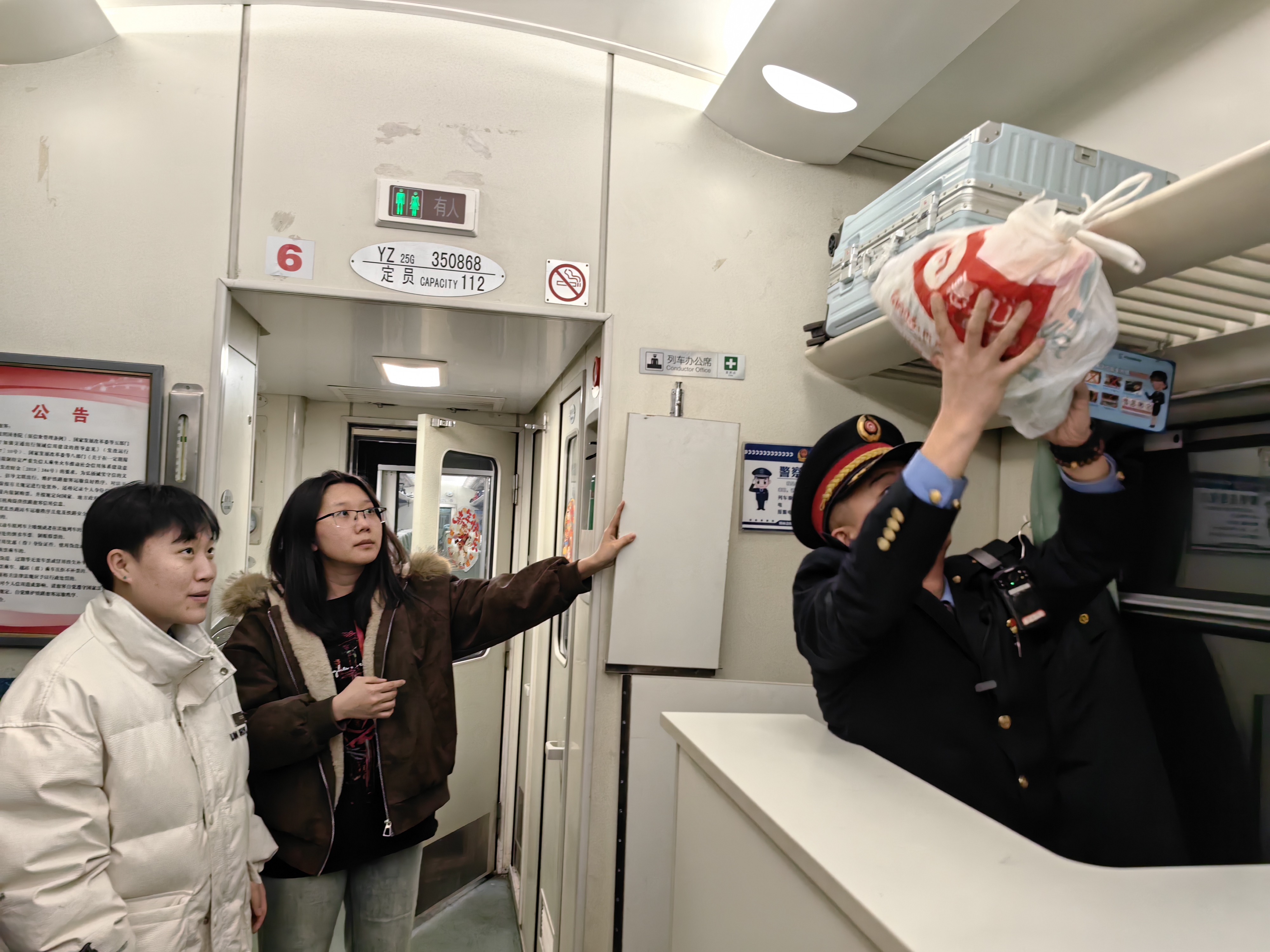 “您好,需要什么帮助?”“您好,是这个包吗?”“您好,是您需要补票吗?”车厢中,列车员们忙碌着。